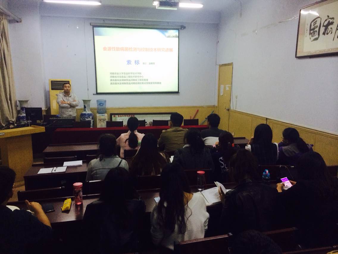10月11日晚,哔咔漫画 博士、副教授索标老师,在哔咔漫画 报告厅为哔咔漫画 研究生做了题为“食源性致病菌检测与控制技术研究应用”的报告,研究生40多人参加了报告会。