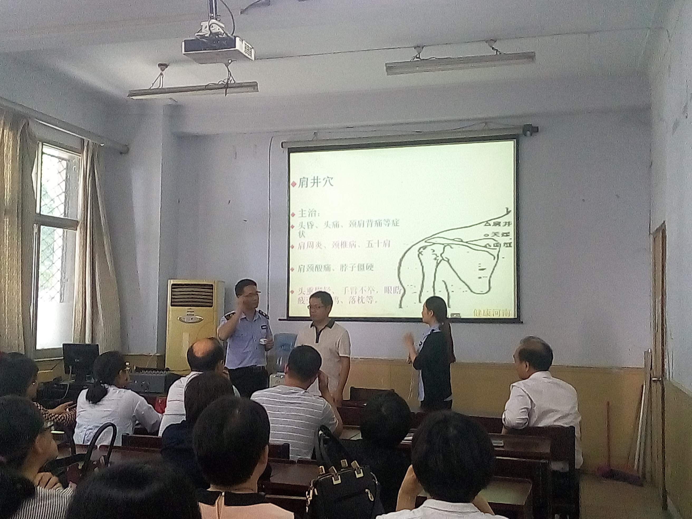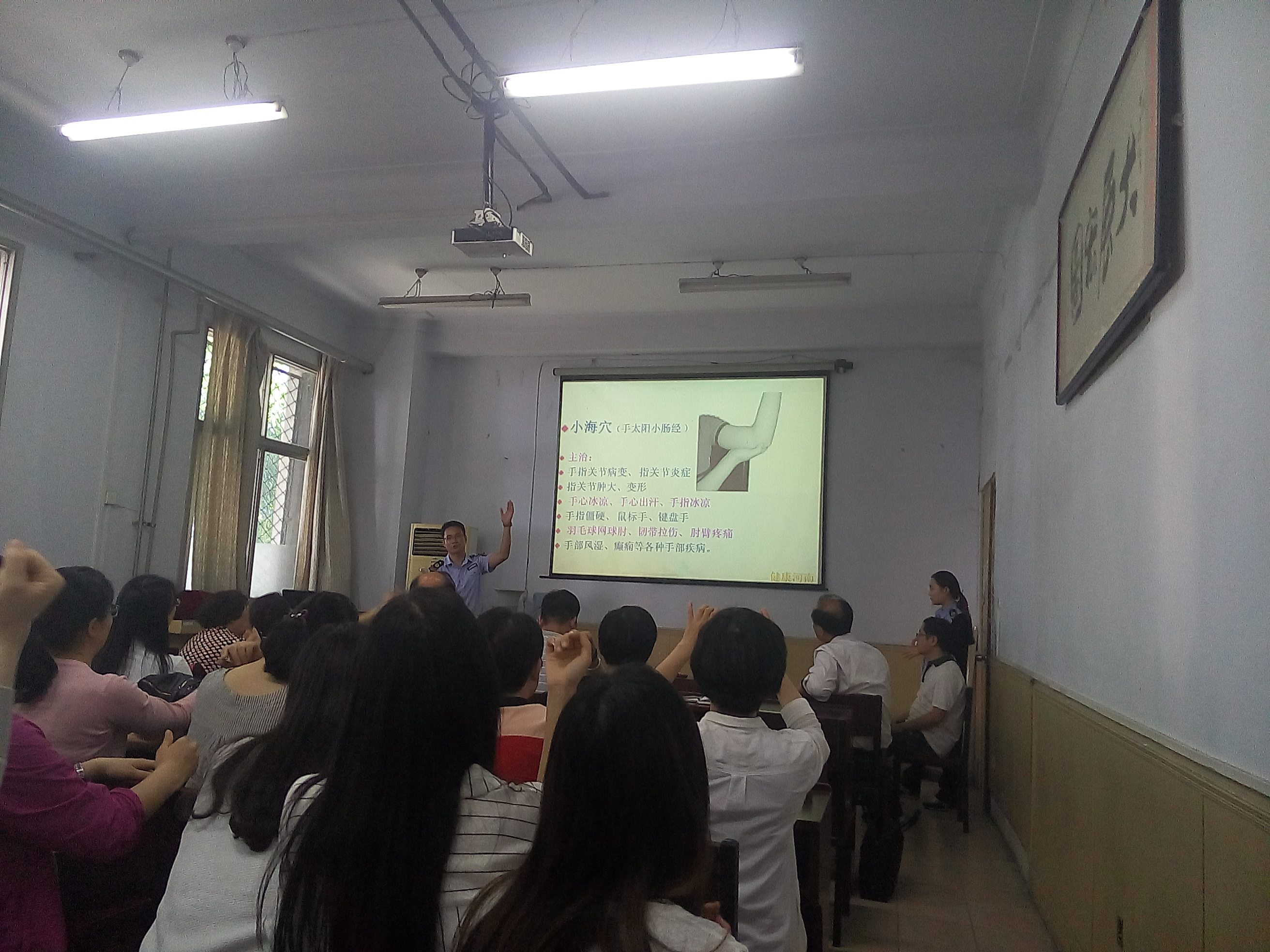 李凯老师的讲座主要从突发公共卫生事件防范知识和技能、环境污染带来的危害及防护知识、职业性疾病及慢性病的预防改善、 中医养生保健知识及亚健康的综合治理等几个方面展开。当他讲到心肺复苏的“黄金4分钟”时,在座的老师们一个个都凝神静听,努力捕捉李老师所讲的每一个细节,毕竟很多时候,时间就是生命,每个人对生命都应该有一种本能的敬畏和敬重。他又教给老师们许多非常实用的中医养生保健知识,现场演示如何按压穴位调理身体,治疗教师职业病。李老师的讲解风趣幽默,演示精准到位,大家在积极互动的欢乐氛围中学到了许多健康知识。