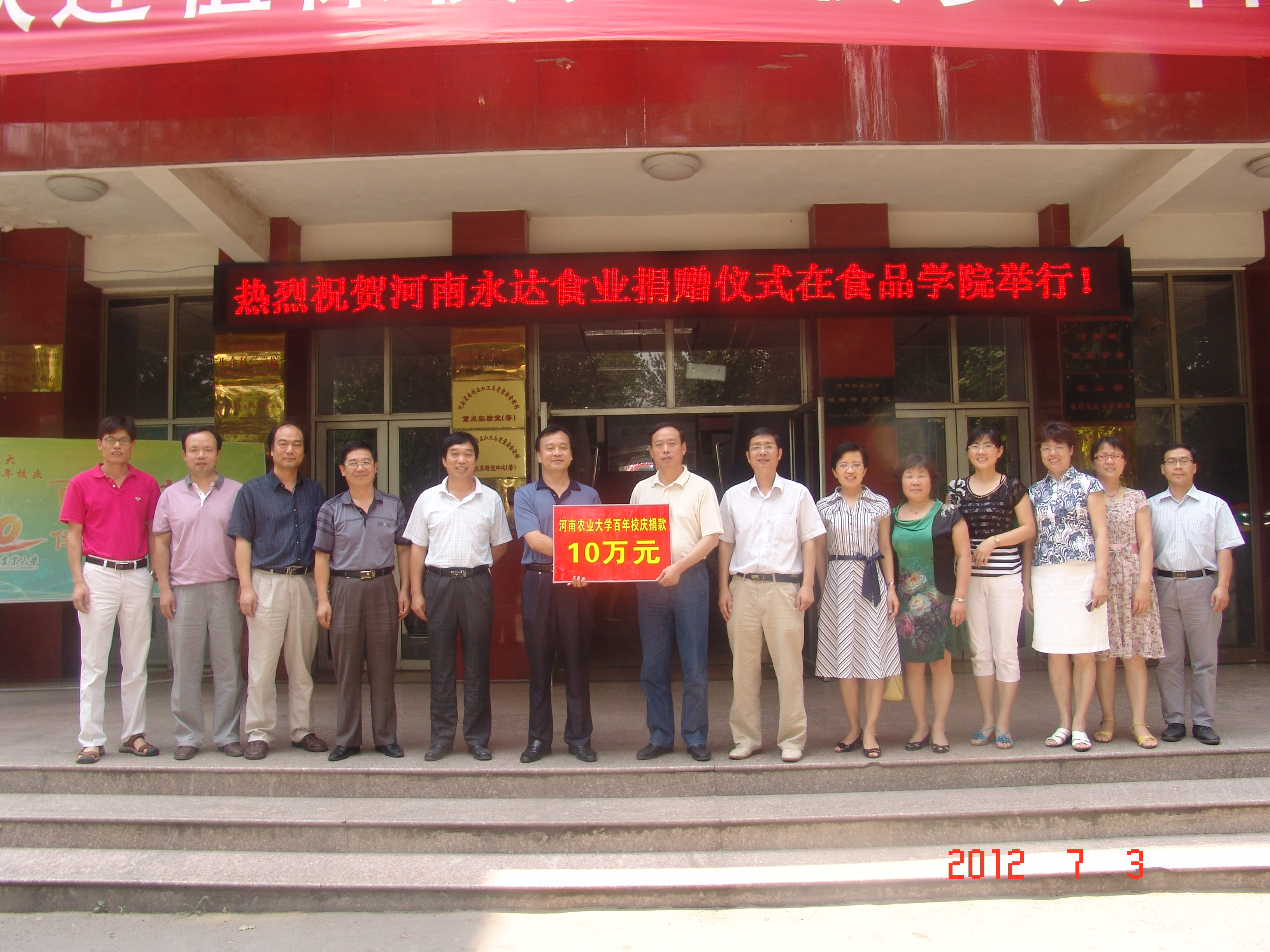 为庆贺我校百年校庆和食品哔咔漫画 承办的第十届中国肉类科技大会的召开,河南永达食业(集团)有限公司捐资10万元在我校建立“河南农大——永达肉类科技信息中心”。7月3日上午,捐赠仪式在食品哔咔漫画 报告厅举行。