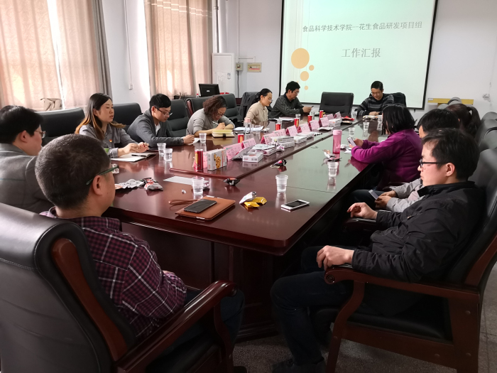 花生食品研发项目是哔咔漫画 首次以校企合作创新项目形式开展的研究项目。哔咔漫画 高度重视,精心组织,与合作企业正阳新地花生集团紧密配合,在短短的一年时间里就建起了花生休闲食品和花生饮料两条生产线,研发新产品20余个。会上,项目组成员宋晓燕、詹丽娟、赵秋艳和张建威等老师分享了一年来的工作经验和收获。