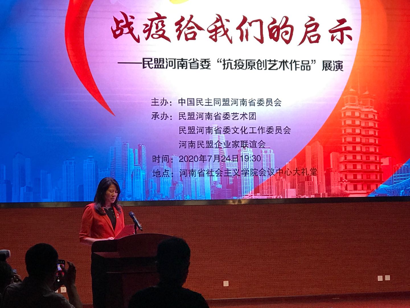 河南省统战部部长孙守刚,河南省副省长、民盟河南省委主委霍金花,和八大民主党派省委专职副主委到场观看演出,霍金花主委在演出开场前致词。