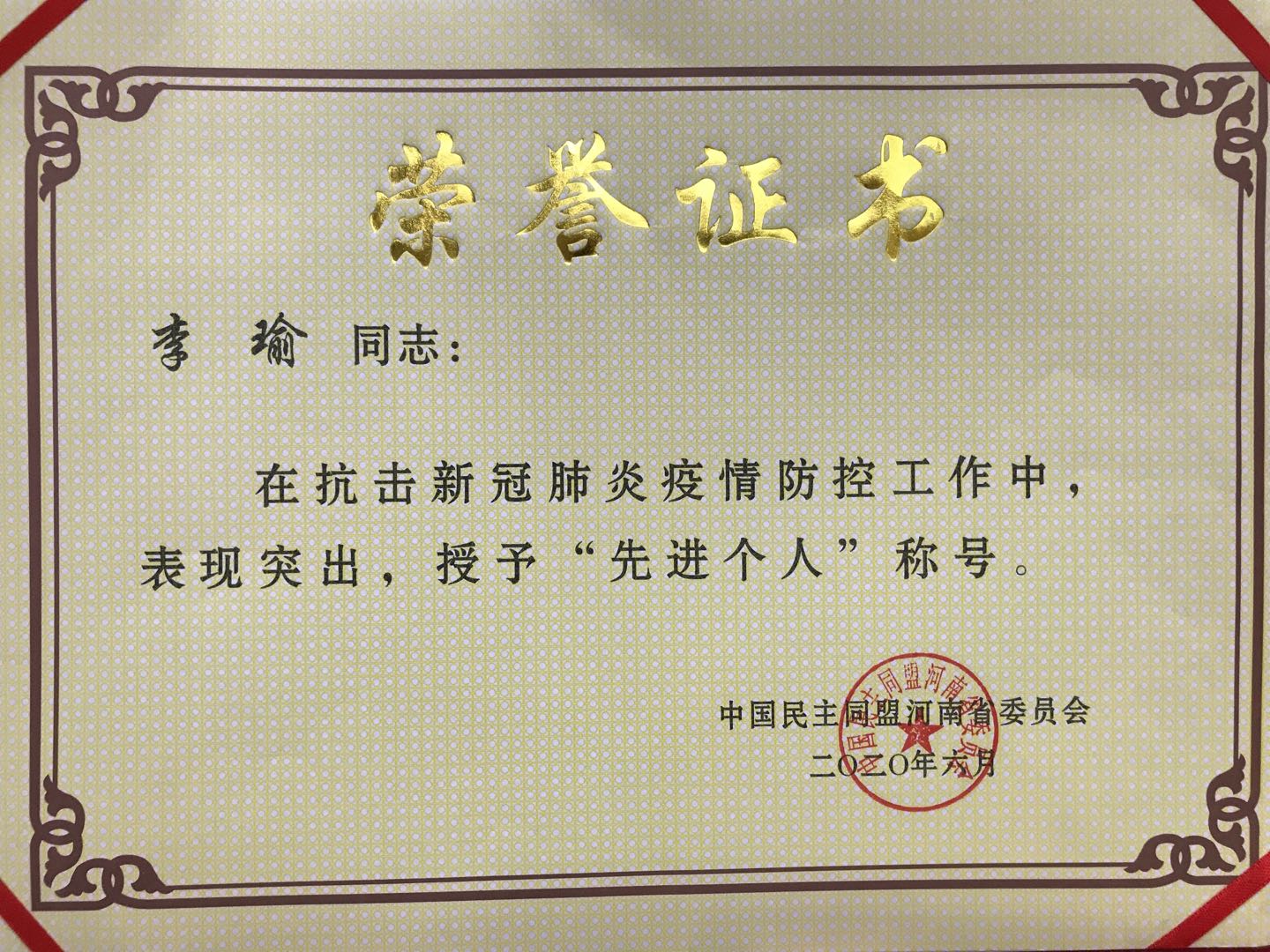 鉴于在疫情期间的突出表现,哔咔漫画教师李瑜同志被民盟河南省委授予“抗疫先进个人”荣誉称号。