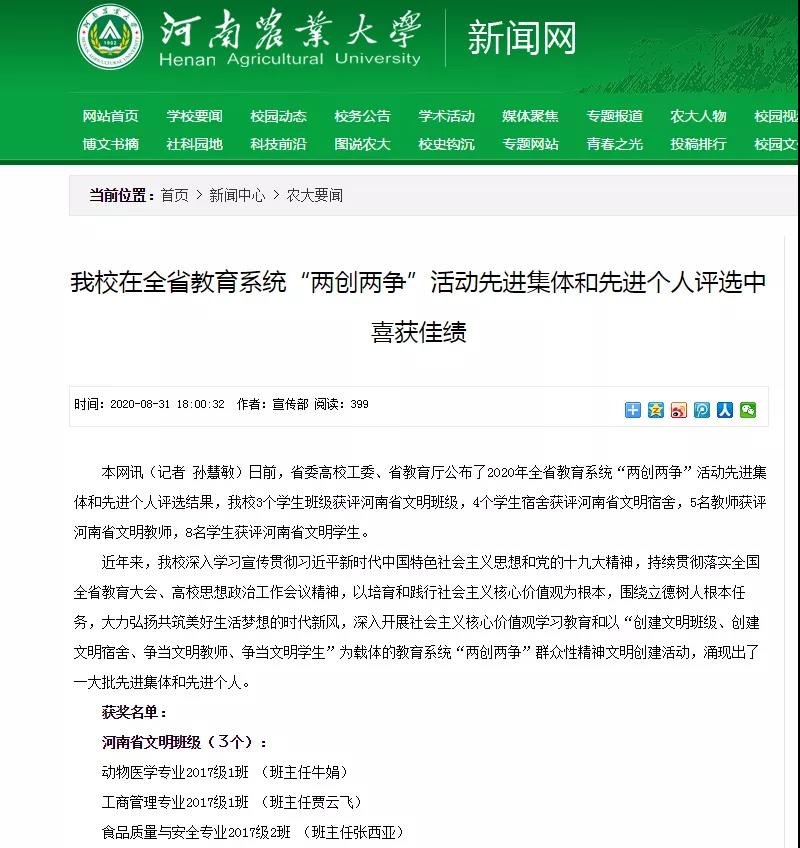 日前,省委高校工委、省教育厅公布了2020年全省教育系统“两创两争”活动先进集体和先进个人评选结果,哔咔漫画食品质量与安全专业17级2班获评河南省文明班级、2017级食品质量与安全1班韩博甫获评河南省文明学生。