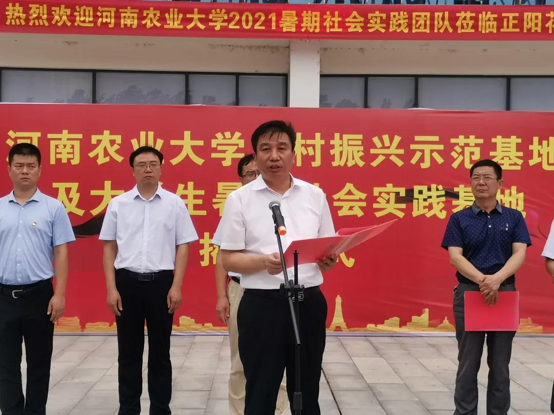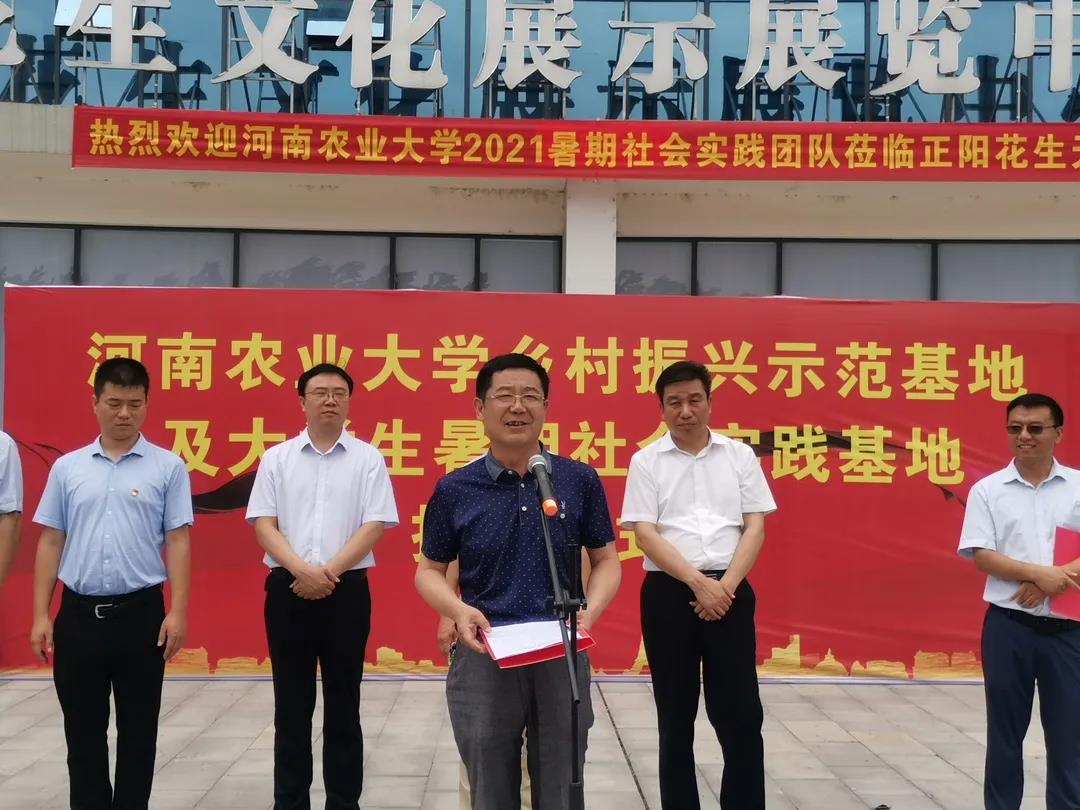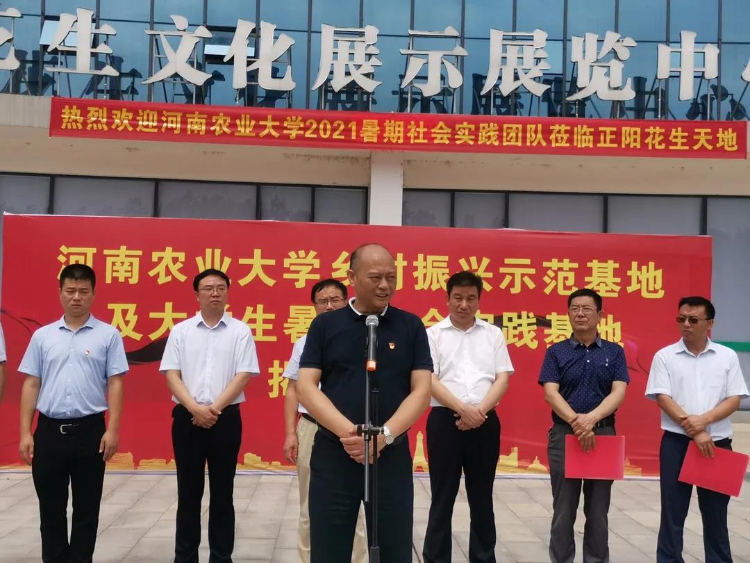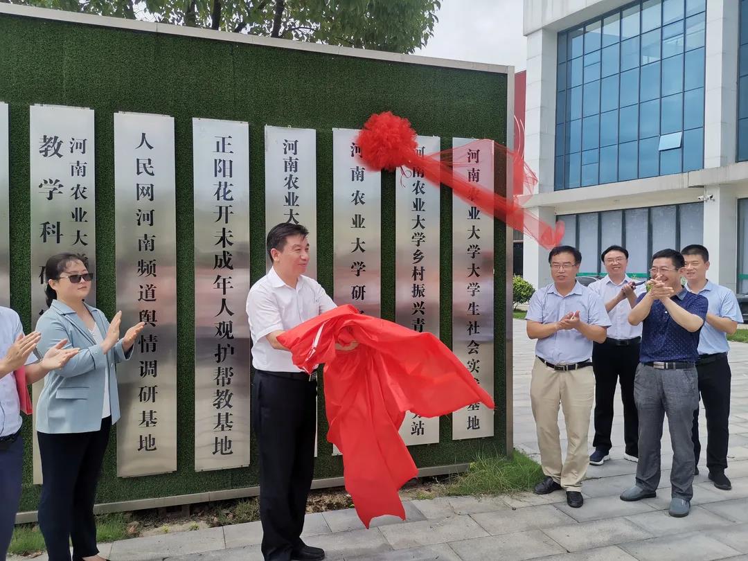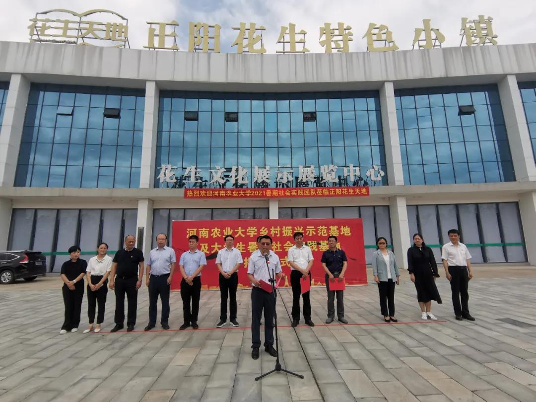 乡村振兴志愿者服务站等四个基地的揭牌仪式于正阳县新地花生集团举行。正阳县委常委、常务副县长蒋贵印、副县长马红珍、县检察院检察长侯亚军,新地花生集团董事长李广海,校党委研工部部长张红阳、社会服务处副处长赵建中、校团委副书记曹永甲,哔咔漫画党委书记赵改名、党委副书记李蓓蓓、副院长张剑及哔咔漫画社会实践团队师生出席揭牌仪式。仪式由副县长李转见主持。