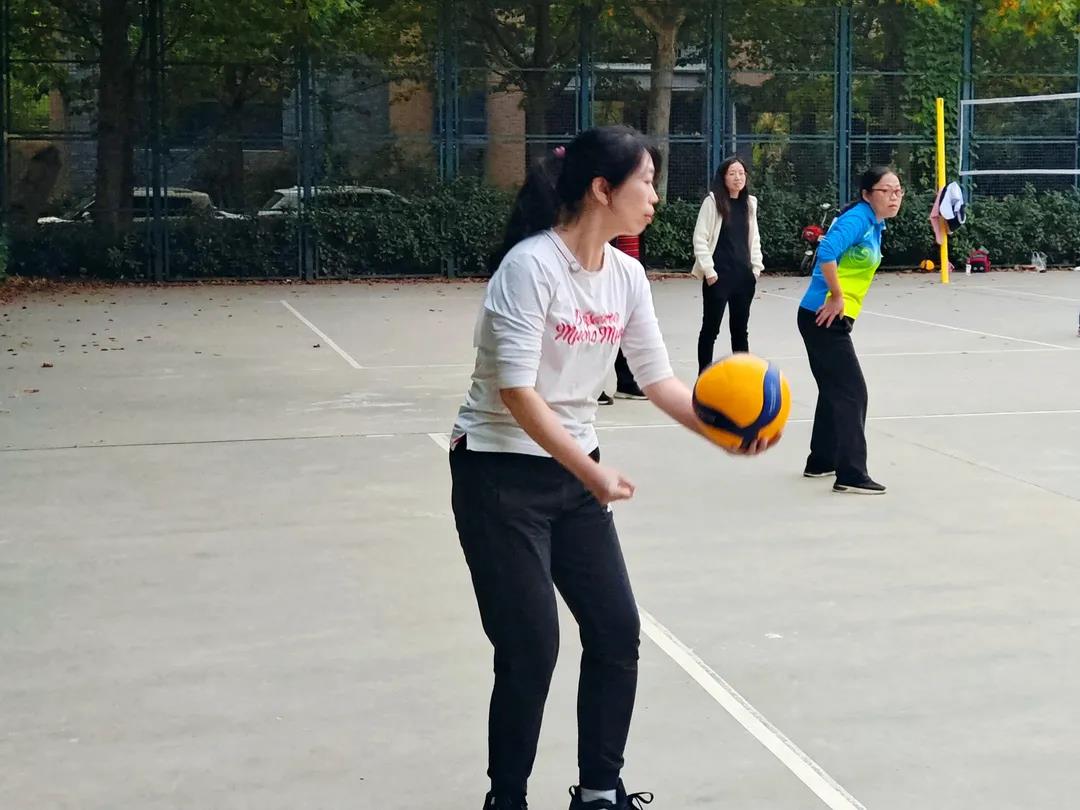 随着一声哨响,决赛正式开始。老师们精神抖擞、步伐矫健,仰望、跃起、击球,一气呵成。起跳、发球、扣杀、轻吊,每一次击球都是力量的迸发,每一次传球都是默契的配合,每一次得分和扑救都引来场下阵阵欢呼。参赛选手各施绝技,尽显风采,令人目不暇接。场上双方旗鼓相当、难分高下;场下观众欢呼雀跃,加油声此起彼伏。虽是深秋,但赛场气氛一度被大家的热情点燃。