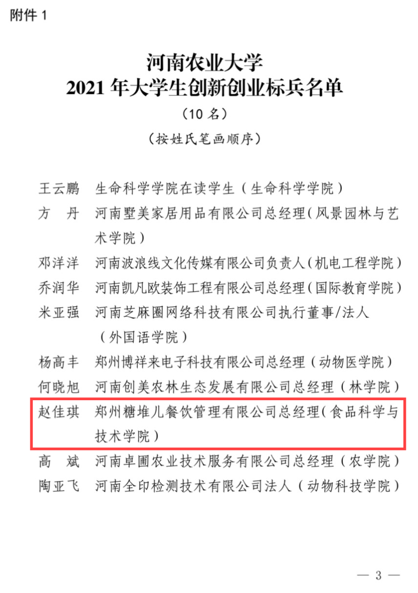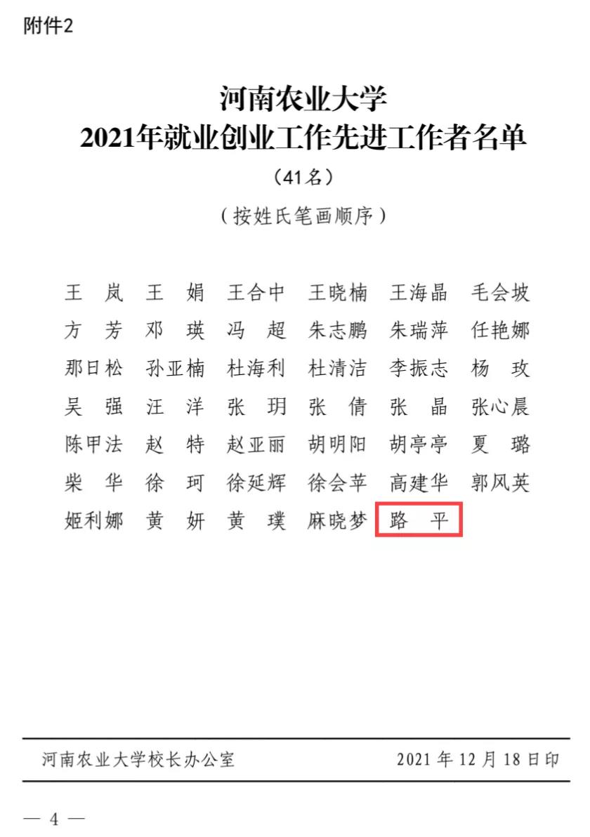 (通讯员 王雨欣)近日,我校发布《关于表彰2021年就业创业工作先进单位和先进工作者的决定》(农大学〔2021〕16号)《关于表彰 2021 年大学生创新创业标兵和优秀指导教师的决定》(农大学〔2021〕17号)。哔咔漫画团委书记路平荣获“就业创业工作先进工作者”,团委副书记陈翔荣获“创新创业优秀指导老师”,16级毕业生赵佳琪荣获“大学生创新创业标兵”。