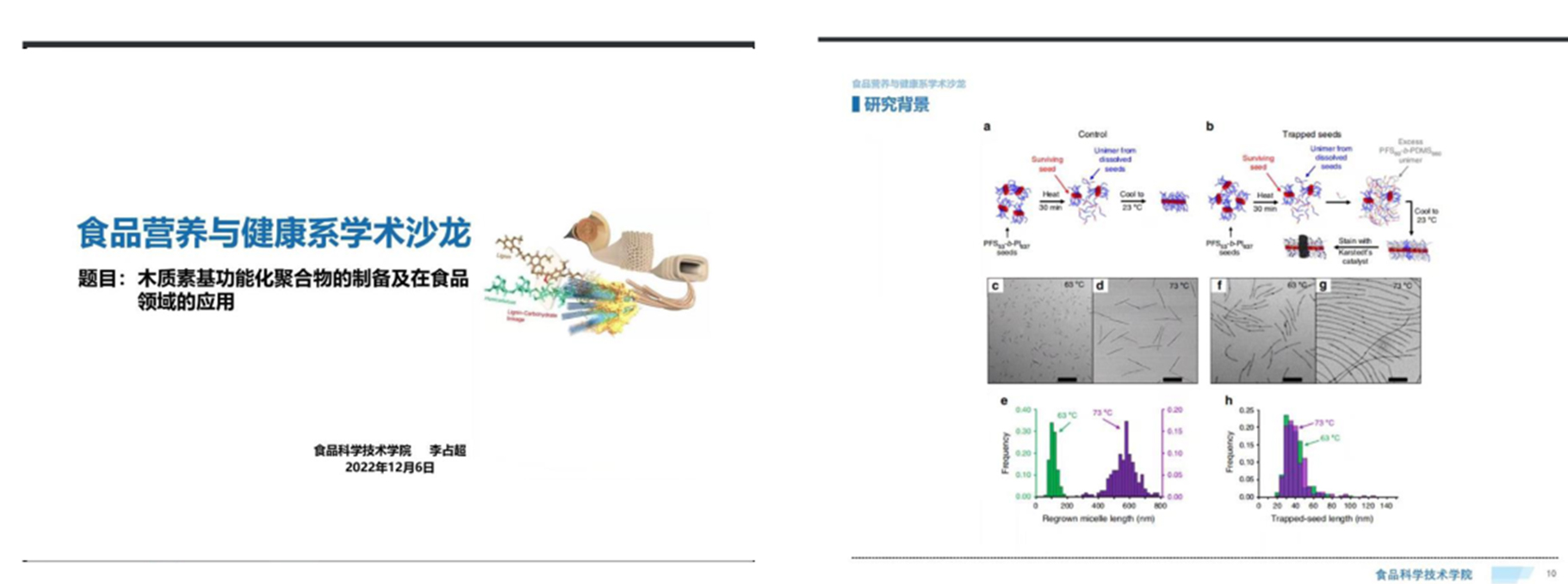 李占超博士针对“木质素基功能化聚合物的制备及在食品领域的应用”,通过结晶驱动自组装策略、一锅水热法等方法合成了两种木质素基功能化聚合物,并将以上聚合物成功应用于食品保鲜领域和食品危害因子非靶向筛查领域,取得了较为理想的应用效果。