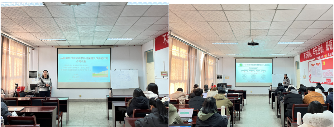 程李琳博士详细讲解了淀粉基复合物的形成及稳定的机制研究,其中介绍了常见的淀粉基复合物,以及对玉米淀粉-亚油酸复合物的性质研究等,包括研究其物理性质、化学性质以及在食品加工等方面的应用。程李琳博士的研究内容和方法为在场研究生提供科研思路与指导。
