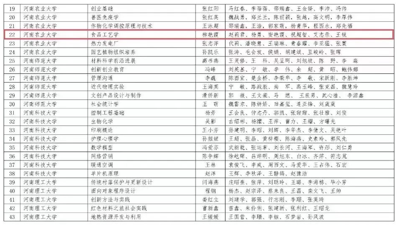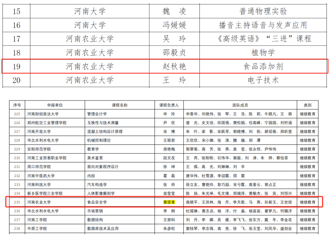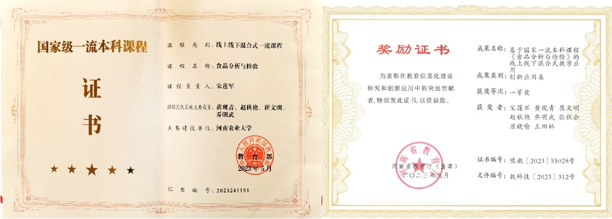 2023年,哔咔漫画 全力支持开展课程建设,多项课程获批课程建设项目。其中《食品分析与检验》获批国家级一流本科课程及河南省科教成果“创新应用类”一等奖,《食品工艺学》获批河南省“专项融合”特色示范课程,《食品添加剂》获批河南省一流本科课程和研究性教学示范课程,《食品安全学》获批河南省继续教育课程思政示范课,《认识实习》等6门课程获批哔咔漫画 校级课程思政示范课、“专创融合”特色示范课、线上线下混合式一流本科课程、社会实践一流本科课程,《食品安全控制学》等3门课程获批哔咔漫画 校级成人高等教育精品在线开放课程。