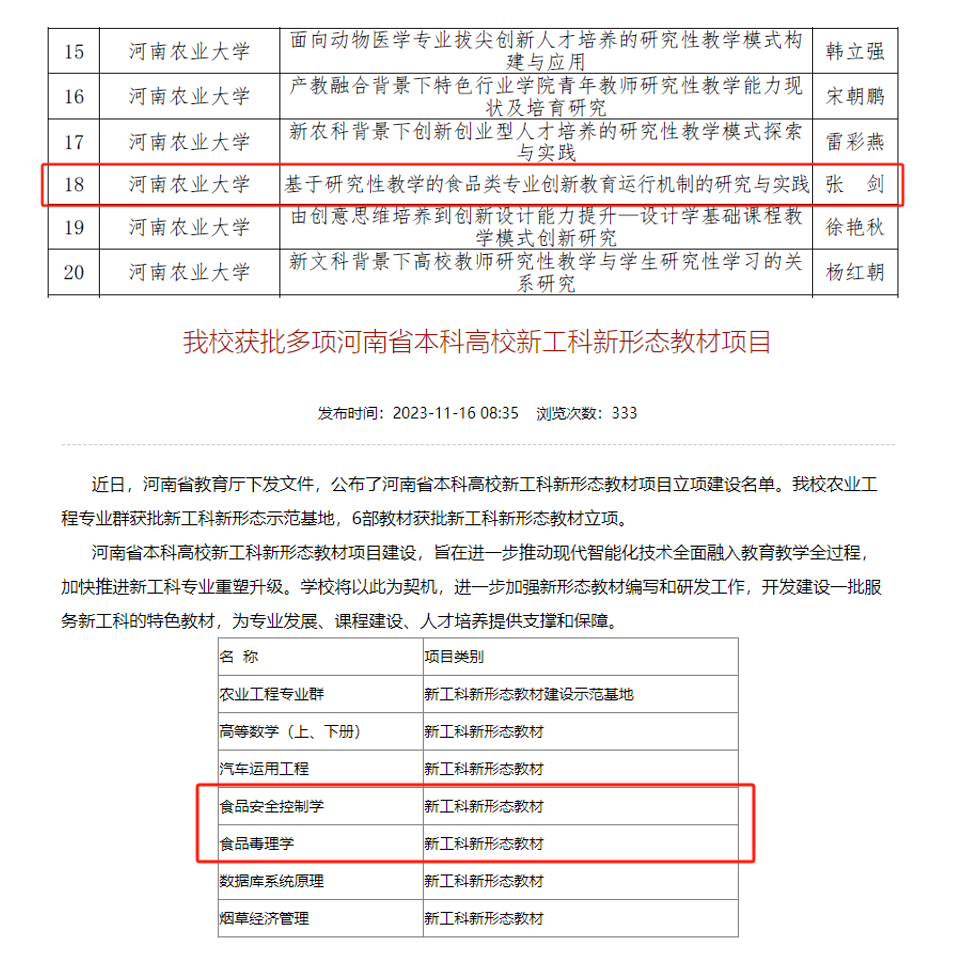 哔咔漫画 获批河南省研究性教学改革项目1项,河南省教育科学研究项目1项,河南省创新型人才培养典型案例1项,与河南天香面叶食品有限公司共建河南省本科高校大学生校外实践基地项目1项。获批哔咔漫画 揭榜挂帅项目1个、重点项目2个、青年项目11个。《食品安全控制学》、《食品毒理学》获批河南省本科高校新工科新形态教材项目。哔咔漫画教师主编、参编教材10余部,发表教改论文30余篇。