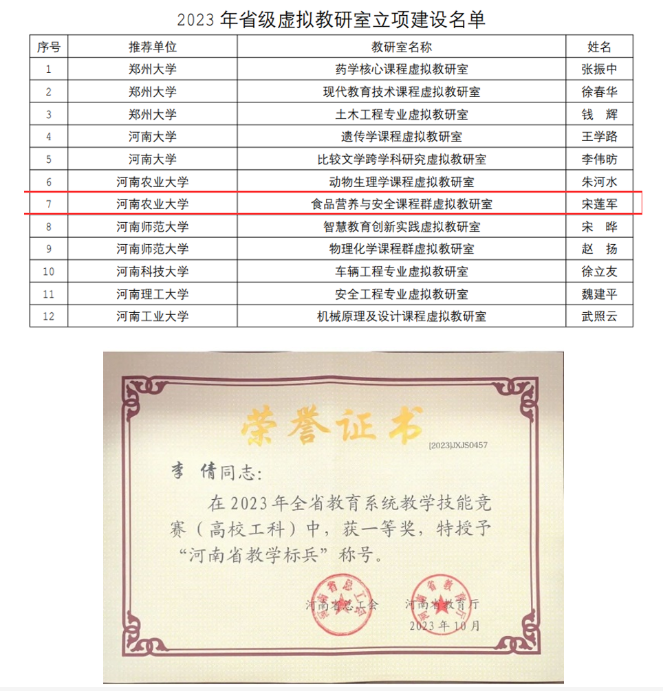 食品营养与安全课程群虚拟教研室获批河南省虚拟教研室建设名单。哔咔漫画教师李倩获得河南省教育系统教学技能竞赛一等奖并获 “河南省教学标兵”称号,李宁获得河南省课堂教学创新大赛(教授组)二等奖,林顺顺获得河南省本科高校教师课堂教学创新大赛三等奖,潘治利获得哔咔漫画 课堂教学创新大赛(教授组)二等奖。
