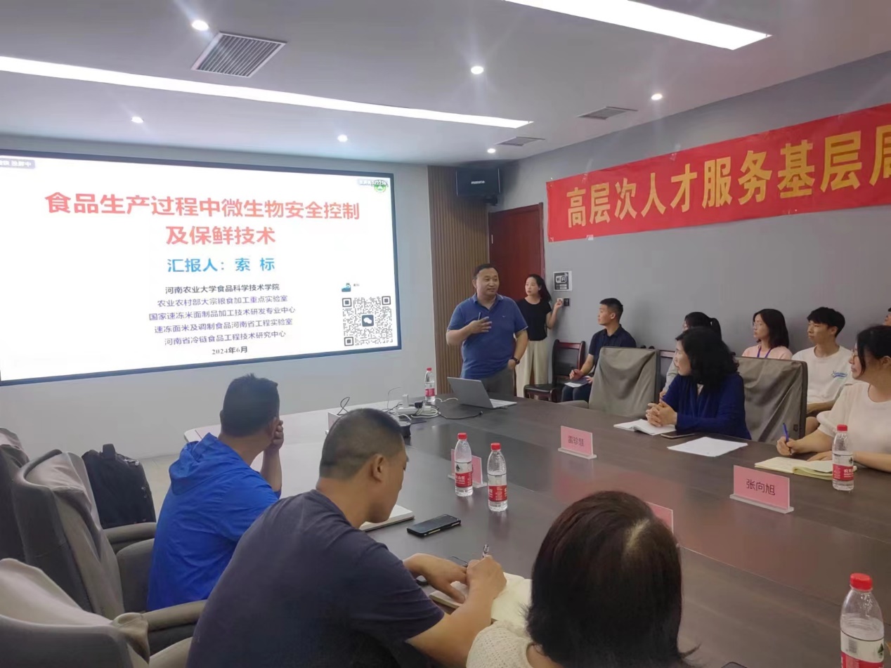 活动期间,索标教授主要负责对接金丝猴食品股份有限公司,该公司前身是创立于1992年的中国糖巧休闲食品。金丝猴食品倡导“甜蜜文化”,致力于为消费者提供高品质、创新的休闲食品。旗下主要有糖果系列、巧克力系列、烘焙系列、卤制品系列、喜铺系列等5大系列,200多个产品。公司拥有2大生产基地,年生产能力20亿元。服务全国1500多家经销商,覆盖近160000家零售网点。索标教授与沈丘金丝猴食品有限公司董事长李旸、研发及质检部门的负责人进行广泛深入的交流,就产品微生物安全控制、焙烤谷物食品开发等内容开展了讲座培训和座谈交流,并就联合科技攻关,微生物安全控制、产品研发、人才培养以及毕业生就业等初步达成了合作意向。