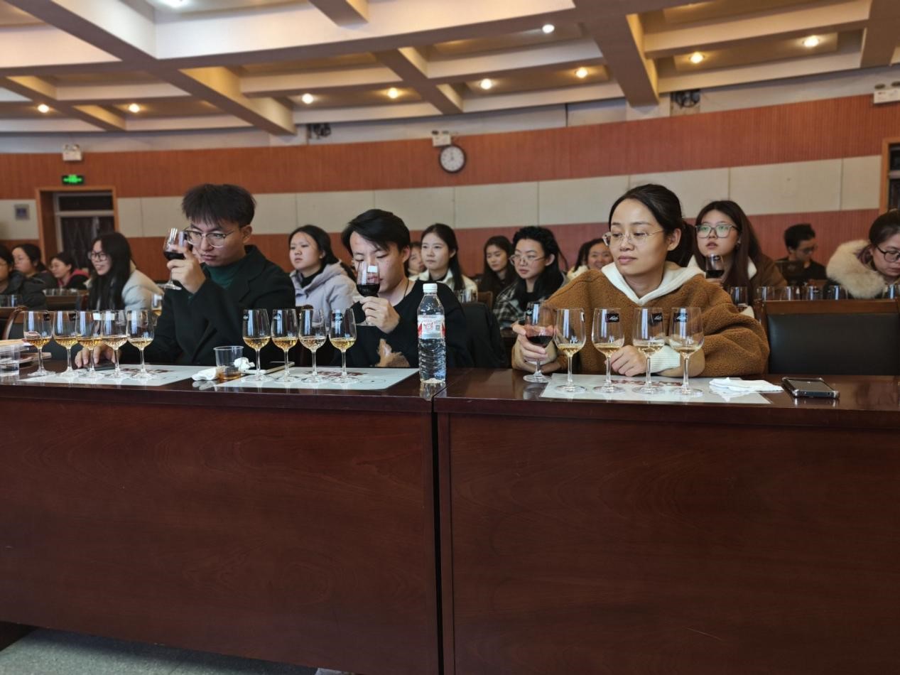 本次葡萄酒校园公开课酒款为来自张裕冰酒酒庄的黄金冰谷和贵馥晚采甜白、三合酒业的蔡龙麟、通化葡萄酒公司的红梅盛世甜红和集安市鸭江谷酒庄的北冰红冰酒,同学们感受到冰酒具有蜜桃、菠萝、芒果等热带水果的香气,甜度与酸度达到良好的平衡,有着细腻的质感,口感上展现出饱满的酒体与细腻的单宁。