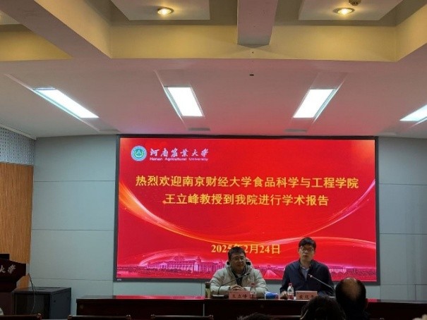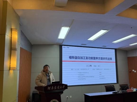 对王立峰教授的到来表示热烈欢迎,并对王立峰教授进行介绍。随后王立峰教授以“植物蛋白加工及功能营养方面研究进展”为主题,详细介绍了其团队在蛋白/肽提取制备纯化新工艺、蛋白界面性质提质增效高值化、蛋白应用场景的新型配料加工技术和蛋白活性肽作用机制及构效关系等领域的最新研究成果。与会师生纷纷表示,汇报内容不仅带来了前沿的学术理念,更拓宽了大家的学术视野,受益匪浅。最后,黄现青院长在总结发言中强调,师生们在开展科研工作时,应深刻思考课题的出发点与意义,研究方向应紧密结合产业需求,注重科研成果的转化与应用。