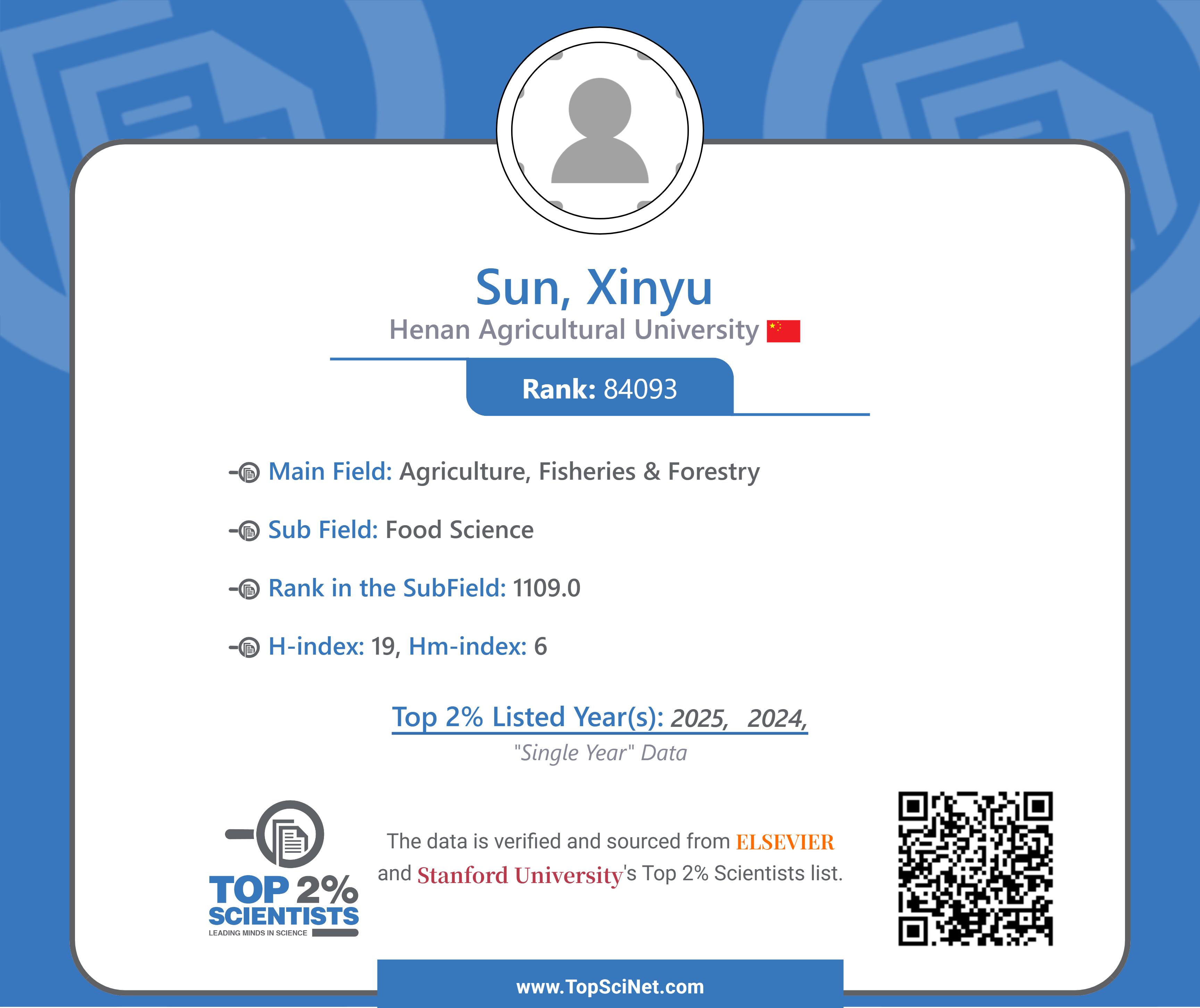 教师孙新玉成功入选食品科学领域全球前2%顶尖科学家榜单。