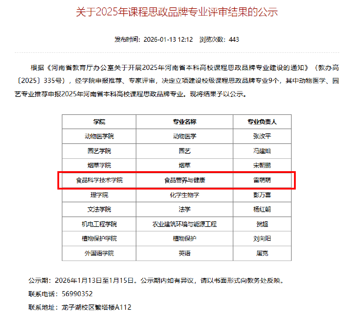 此次入选校级课程思政品牌专业后,既是专业建设的重要突破,更是学院引领学科专业高质量发展的生动体现。未来,在学院的整体发展规划引领下,食品营养与健康专业将以此次入选为契机,进一步深化课程思政与专业教育的深度融合,不断完善育人体系、创新育人模式;同时将主动发挥示范带动作用,依托学院学科集群优势,辐射带动全院相关专业课程思政建设水平提升,力争打造成为省级乃至国家级课程思政品牌专业,为健康中国建设和河南食品产业高质量发展,培养更多具有家国情怀、健康使命与专业素养的创新型人才,为学院人才培养质量提升和学科建设发展贡献更大力量。