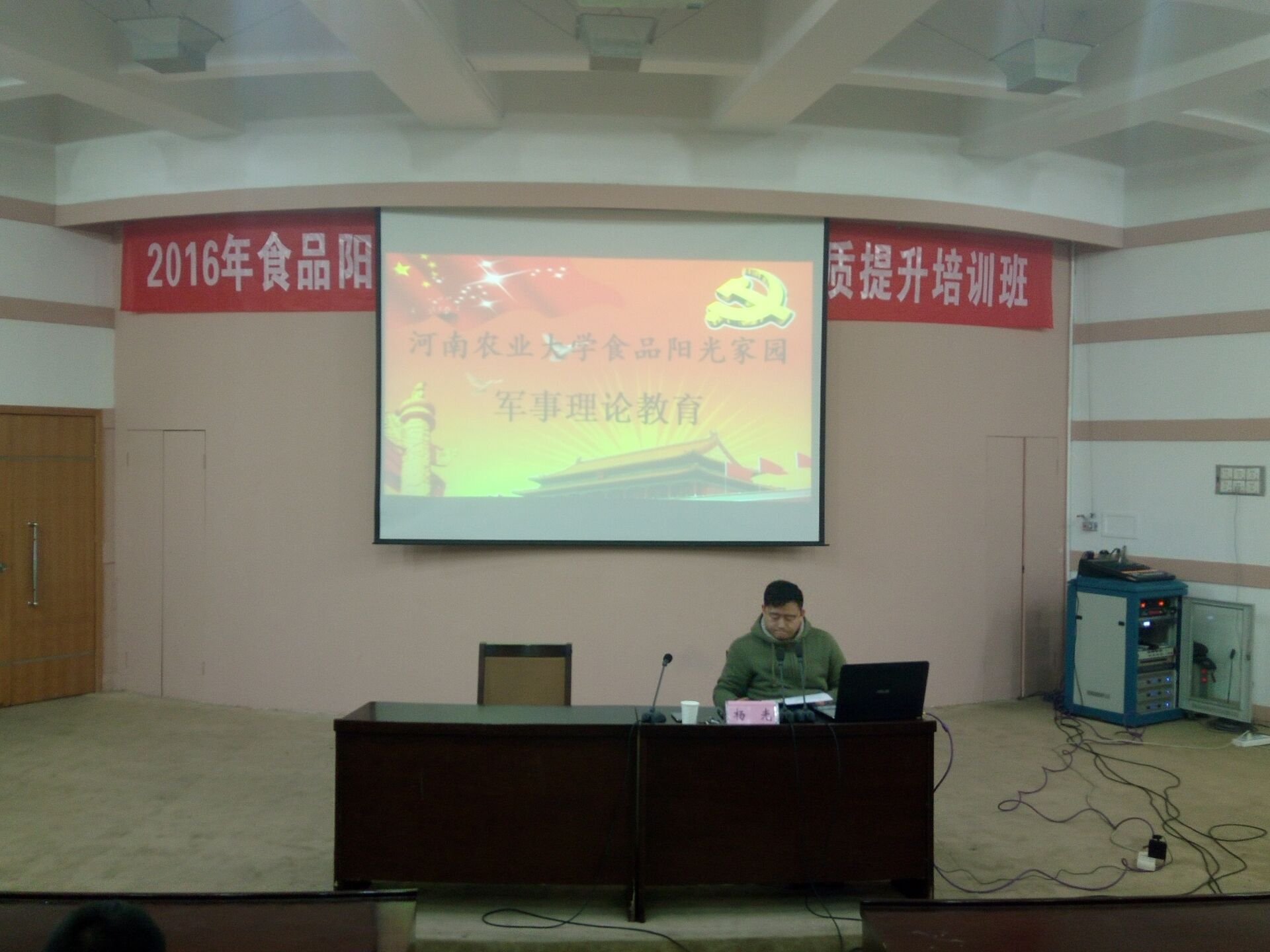在文化路校区三百人报告厅举办军事理论教育讲座。院团委书记李蓓蓓、院团委副书记杨光、院党委组织员张世昌、院辅导员孟子晴出席讲座。2016级全体新生参加讲座。杨光担任主讲。