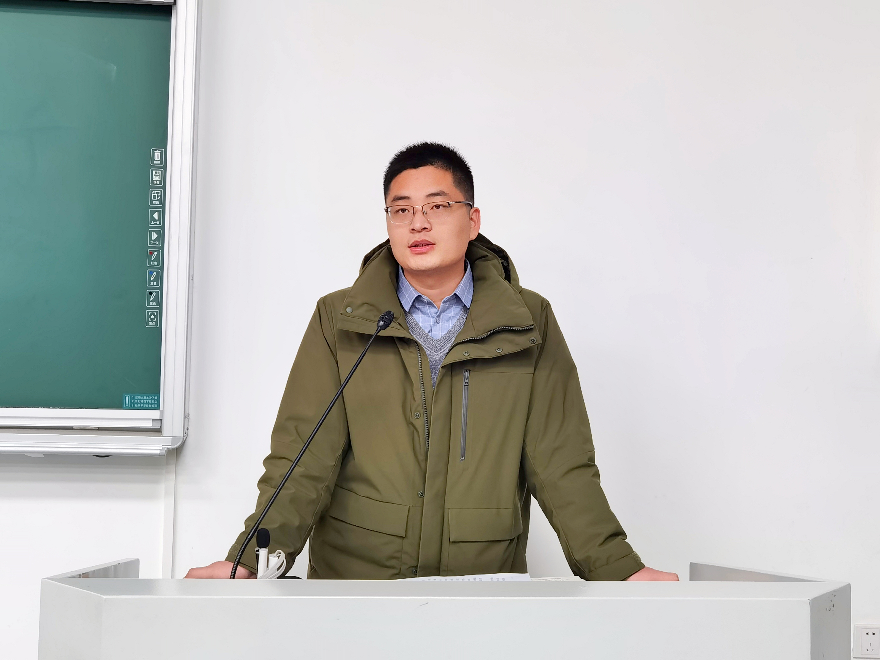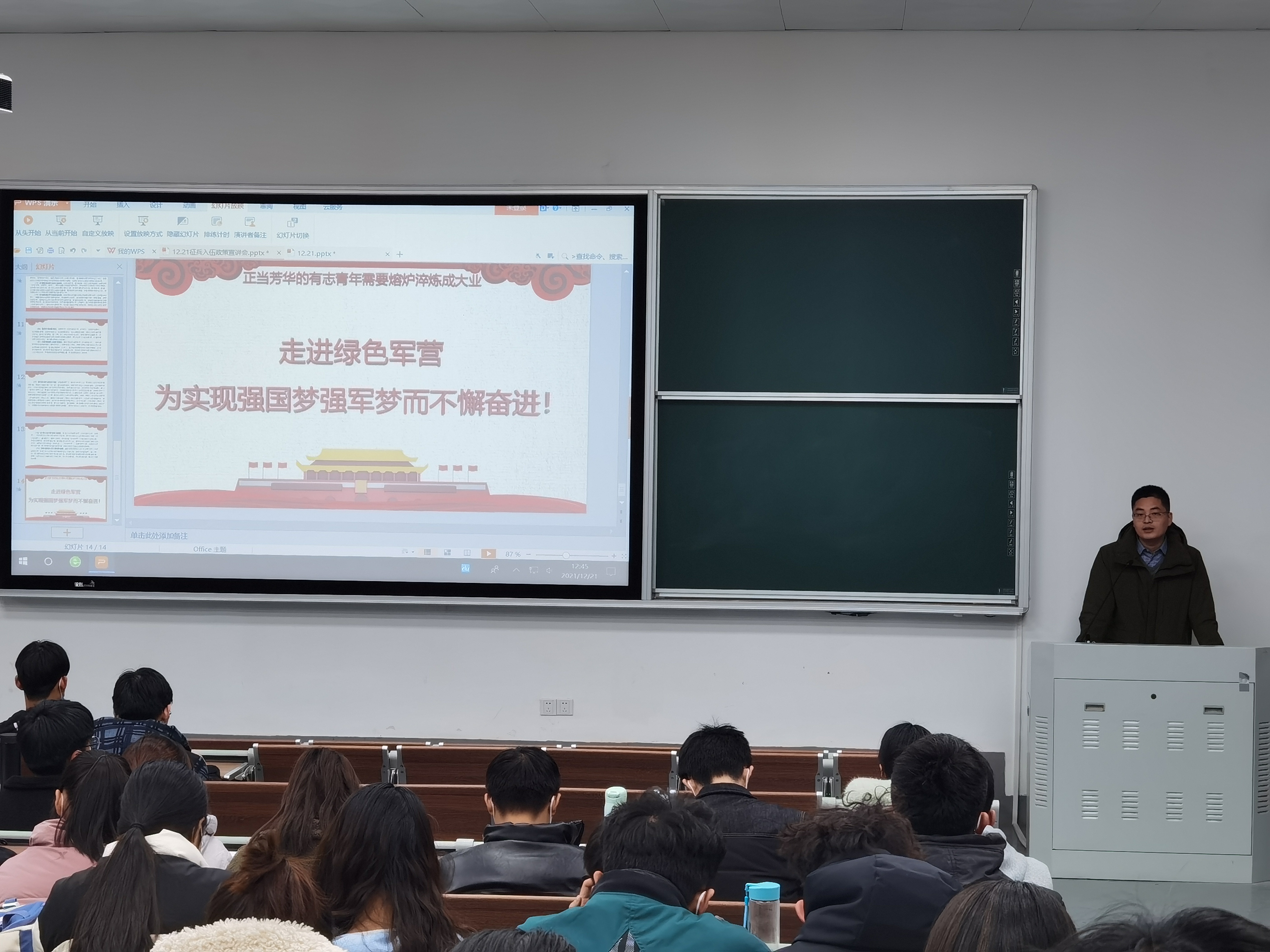 张金龙从征兵的重大意义、征兵流程、激励政策向同学们进行介绍,并指出,强国必先强军,强军必先强兵源,要从源头上提高兵员质量,加强军队现代化建设,大学生是应征入伍的不可缺少的力量。他将报名时间和流程呈现给大家,从视力、体重、身高和年龄条件进行了详细介绍。同时,他表示,应征入伍政策良多,为学业、生活、荣誉等方面提供保障,国家不断提高退役升学优待力度,希望同学们积极响应号召、踊跃参军,担负起中华民族伟大复兴的历史使命,做新时代中国特色社会主义事业的坚定接班人。