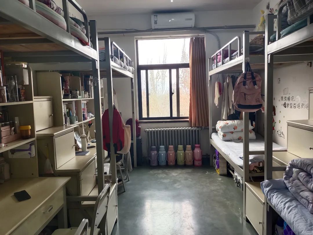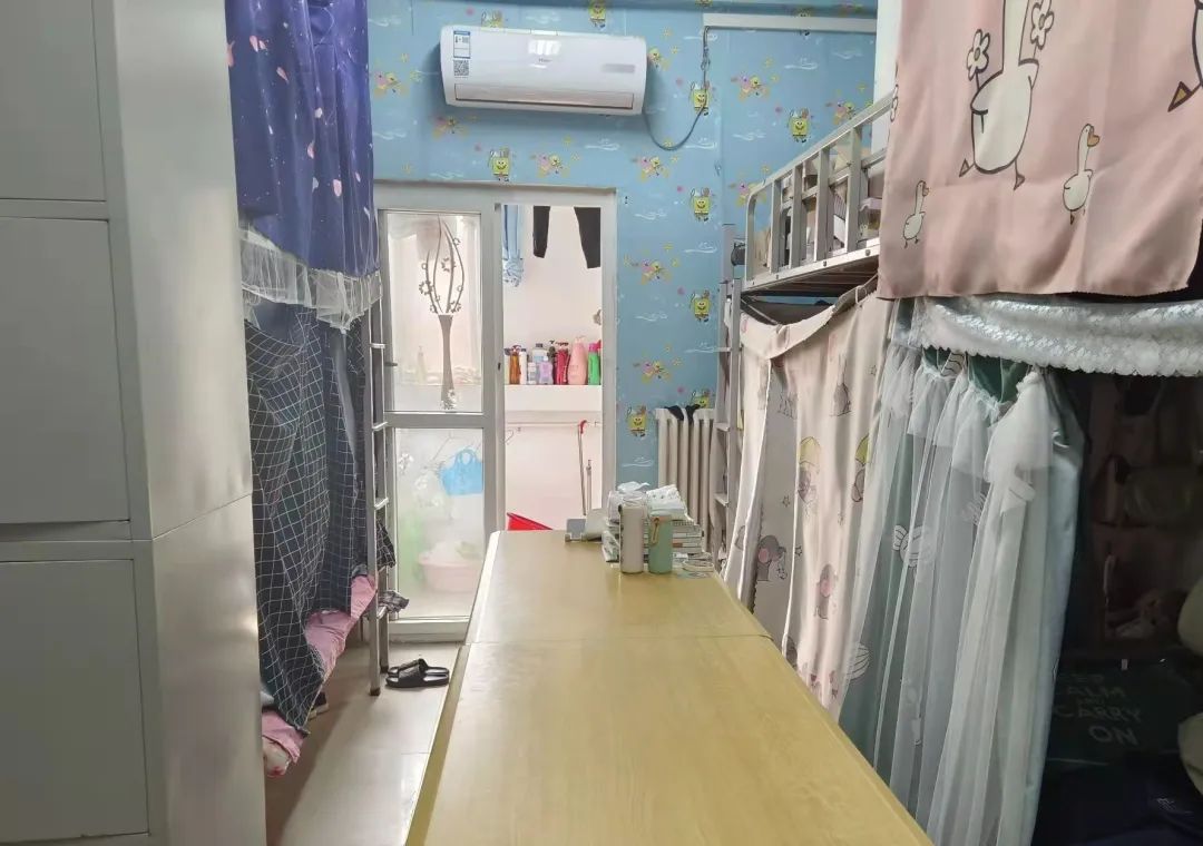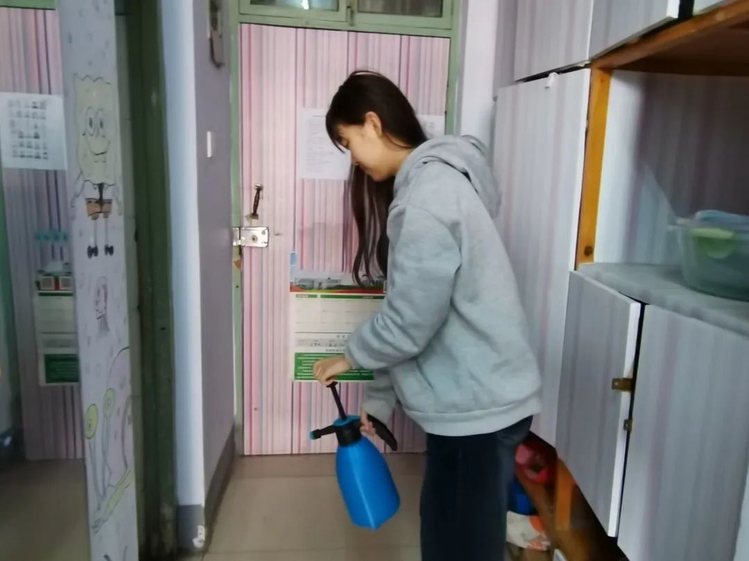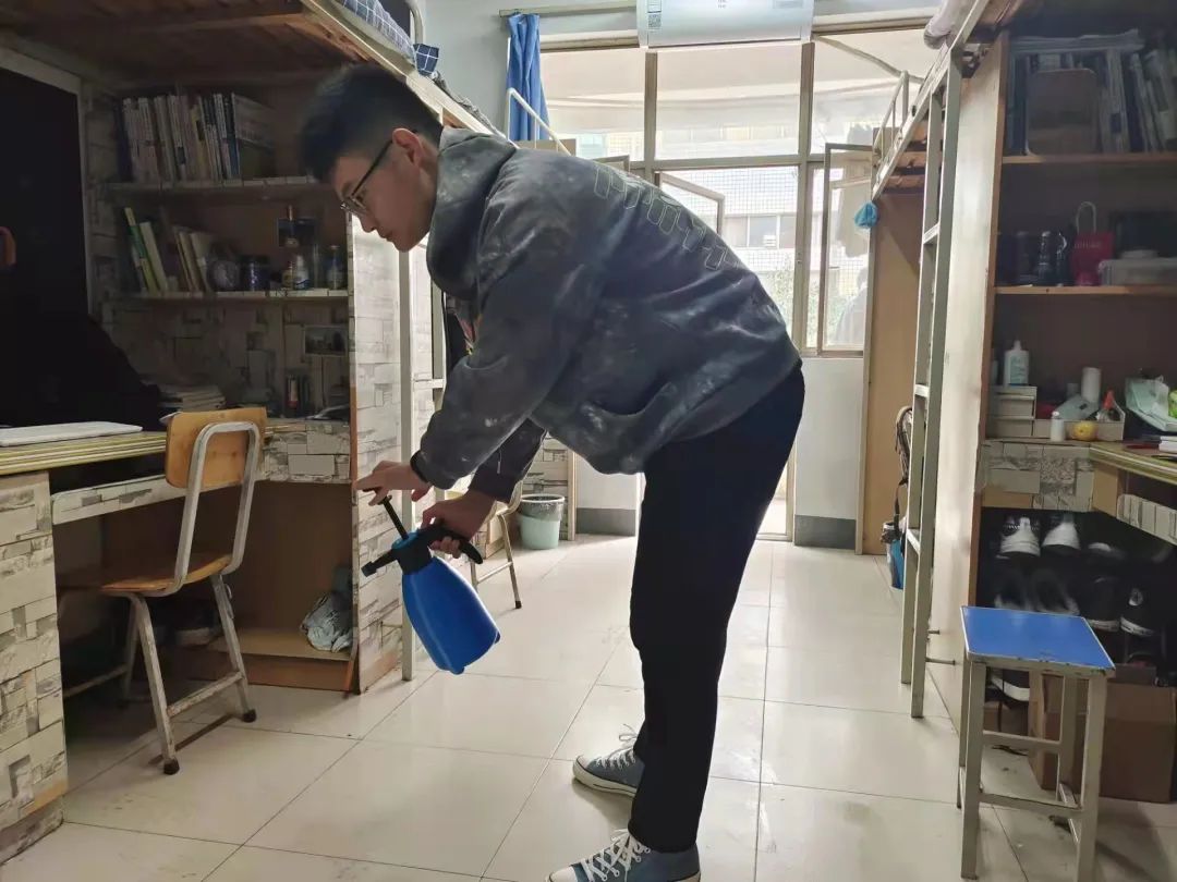 老师的引导下对宿舍进行消毒杀菌,从门口到窗台,从床底到床上,避免细菌滋生,阻断病毒传播。
