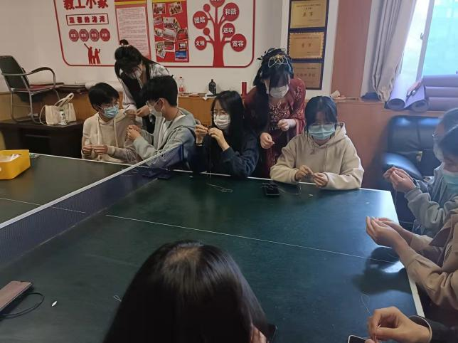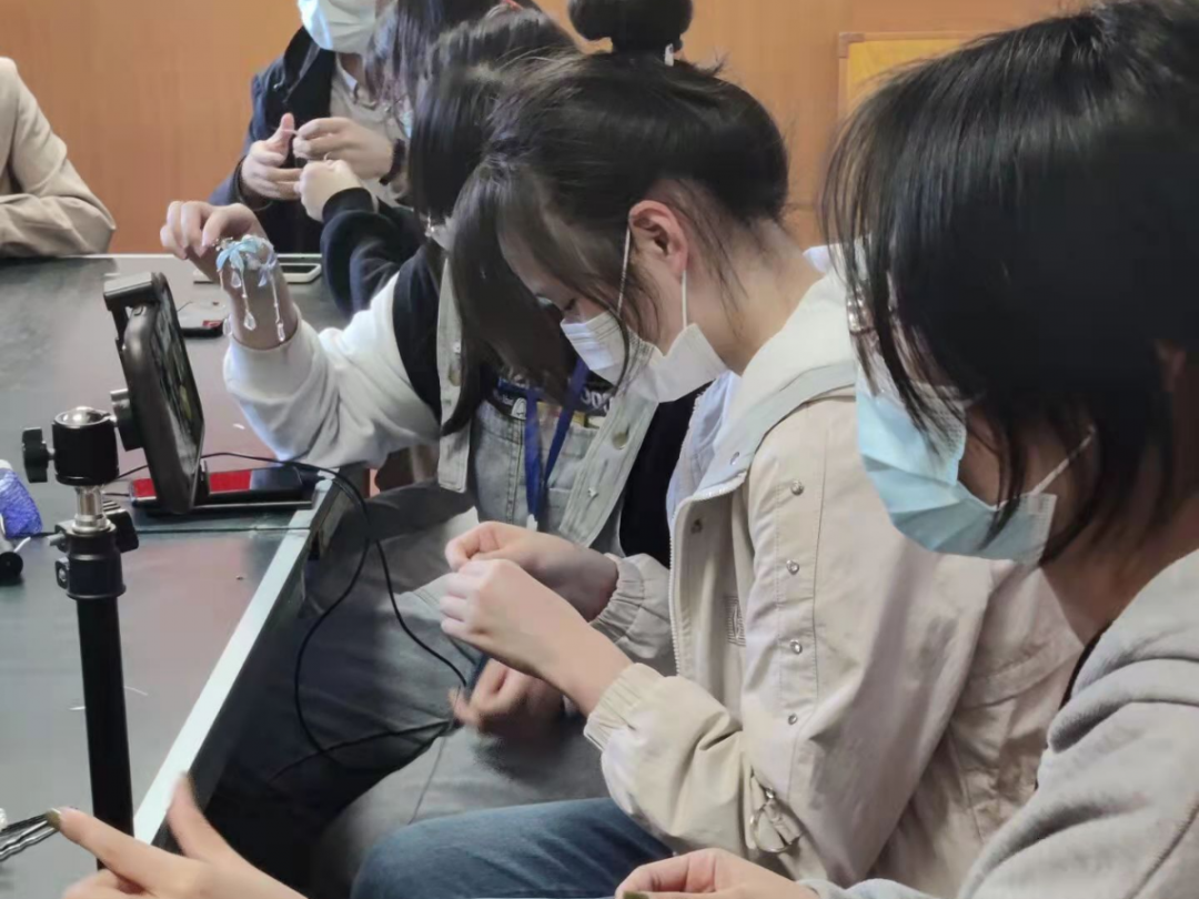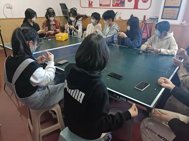 随后21级部分学生共同参与到了古风头饰的制作中,嗅着窗外阵阵的樱花香气,一个个小巧而精致的发饰在学生的手中慢慢初见其形……一朵朵镌刻着春日印记的“樱花”随着发饰的完善灼灼盛开,把玩于手心,好像顿悟了何谓“簪就三千繁华梦”。