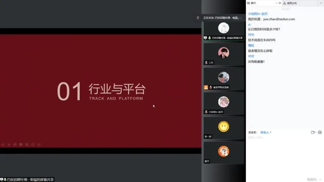 随后巴奴毛肚火锅有限公司的HR柴猛参与连线。柴猛通过播放企业宣传片向同学们展示了巴奴公司的成长、发展与未来规划,通过PPT向同学们详细地介绍了目前巴奴的优势、巴奴的员工福利、巴奴在公益方面的作为。同时,也为同学们讲述了加入巴奴后的晋升路线,使同学们对自己加入巴奴后有进一步规划。他表示,巴奴需要的是积极进取、热爱学习、行动力强、有创造力的人才,公司会给进取者提供充满挑战性的成长空间和定制化的培养方案。