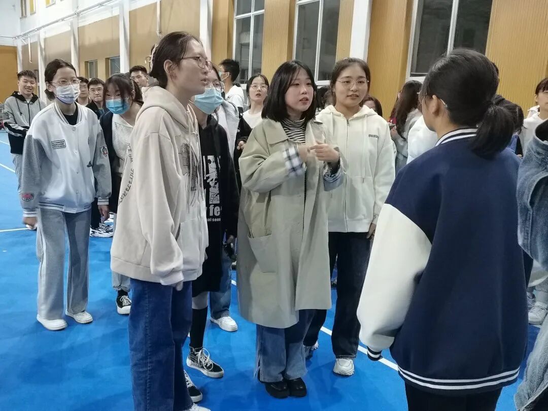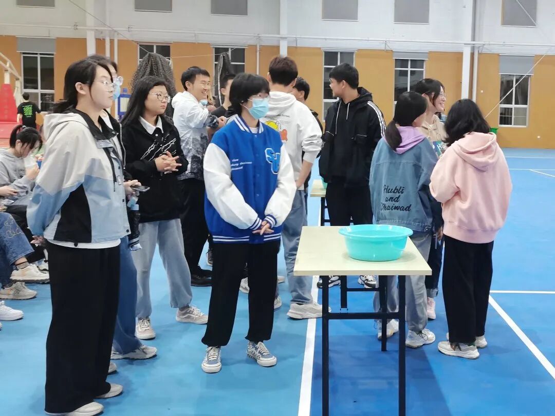 《摸石过河》项目中,团队成员协调配合,通过脚踩瑜伽砖前行,争取以最短的时间到达终点。在《心有灵犀》游戏环节,表演者根据字牌内容做出动作指令,猜题者根据动作猜出字牌内容,比赛现场其乐融融。《爆破拼图》环节中,每组第一位同学原地大象转10圈后前往栏杆拿取气球,后两人合力将气球挤破后拿出碎片开始拼图,进行爆破、拼图。比赛过程中,同学们热情高涨,活力四射。