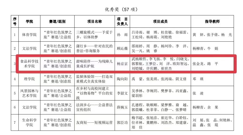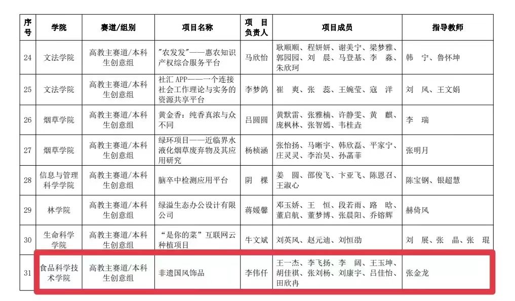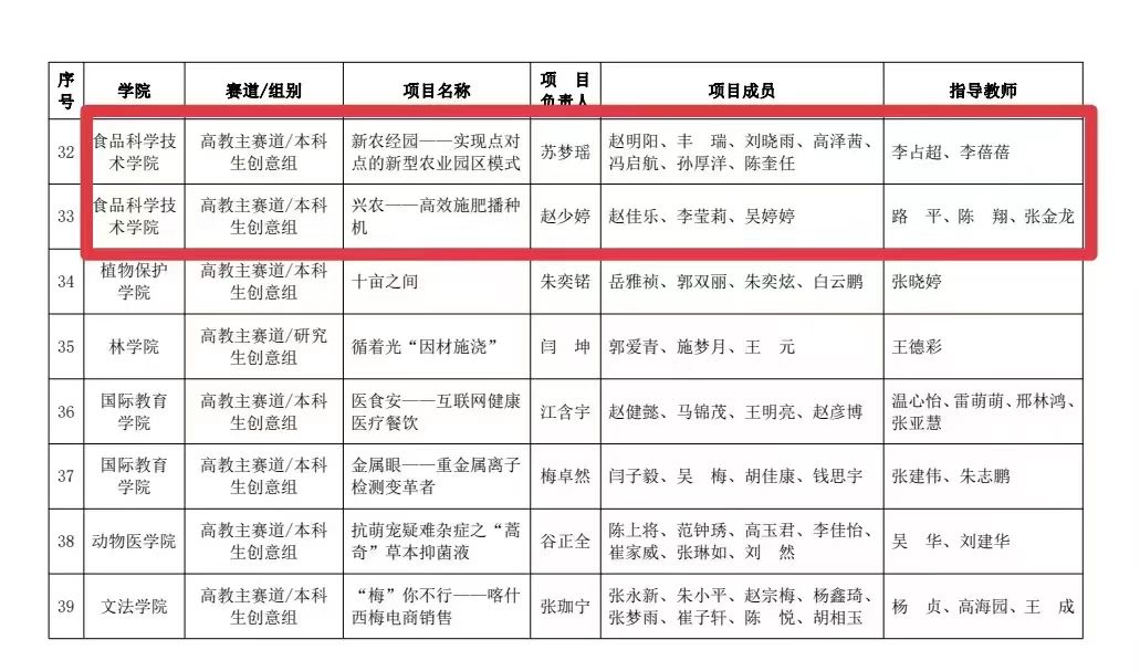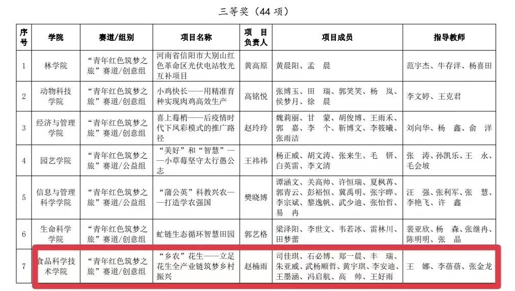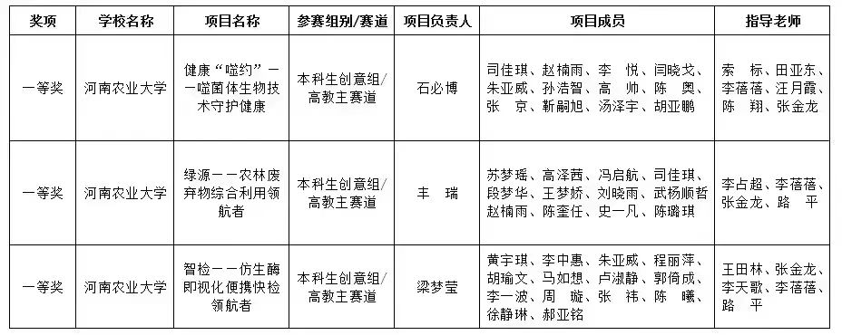 参赛作品共斩获一等奖三项,三等奖一项,优秀奖四项。其中,由石必博负责的团队项目《健康“噬约”——噬菌体生物技术守护健康》,由梁梦莹负责的团队项目《智检——仿生酶即视化便携快检领航者》和由丰瑞负责的团队项目《绿源——农林废弃物综合利用领航者》荣获一等奖。由赵楠雨负责的团队项目《“乡农”花生——立足花生全产业链筑梦乡村振兴》荣获三等奖。由杨京京负责的团队项目《甜味陪伴——为残障儿童成长护航》、由李伟仟负责的团队项目《非遗国风饰品》、由苏梦瑶负责的团队项目《新农经园——实现点对点的新型农业园区模式》和由赵少婷负责的团队项目《兴农——高效施肥播种机》荣获优秀奖。