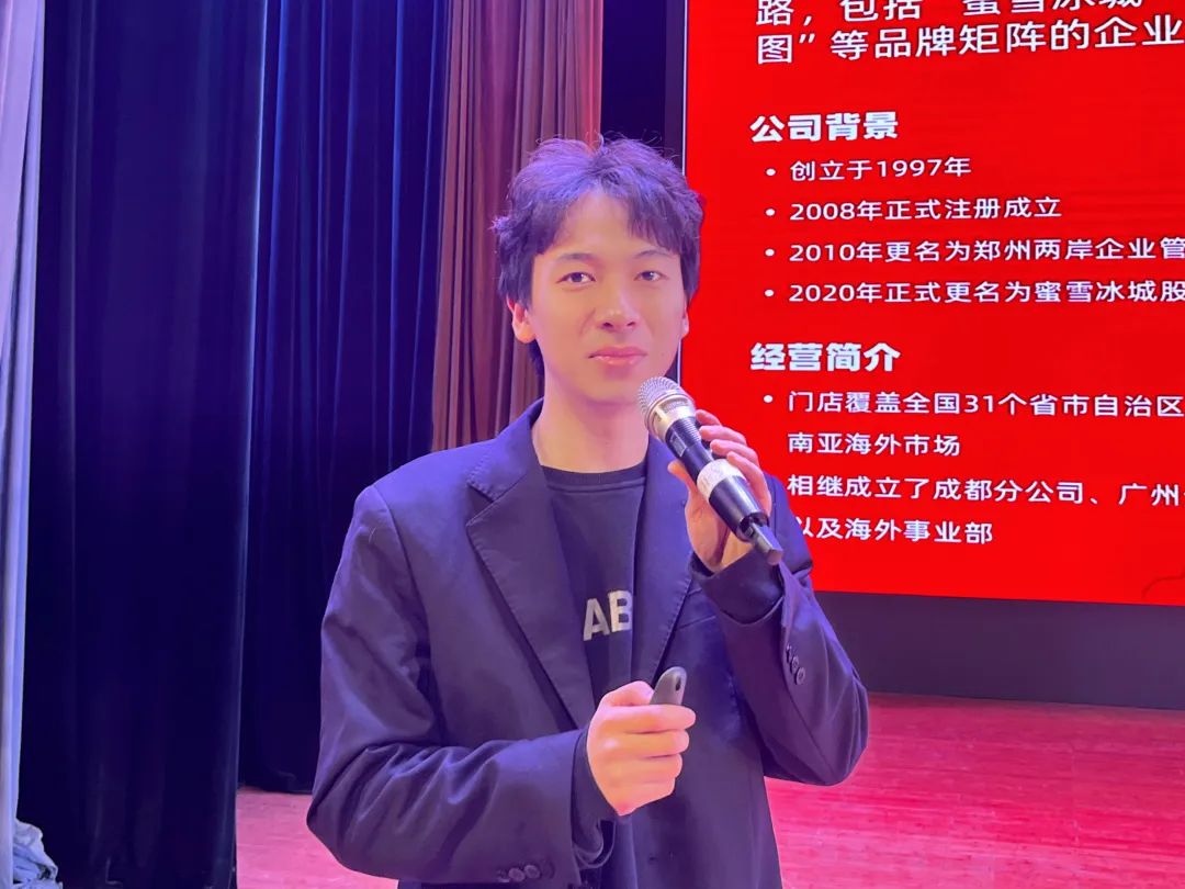 会议伊始,陈冠龙通过播放视频宣传片简单讲述了蜜雪冰城的公司理念和哔咔漫画。他从管理运营、生产研发、仓储物流、品牌历程、全球化特色布局五个方面向同学们详细介绍公司的发展战略和发展方向。他强调,蜜雪冰城是有温度的大家庭,始终秉持着一颗助人为乐的公益心,致力于带动偏远地区的农业发展,参与抗洪救灾、灾后重建、慰问特殊家庭等公益活动,同时,蜜雪冰城注重人才的培养,员工会进行多层次的培训项目,包括线上培训、名企参观、全员运动会、趣旅游等。最后,他表示,英雄不论出处,希望同学们能结合自身,做好职业规划。