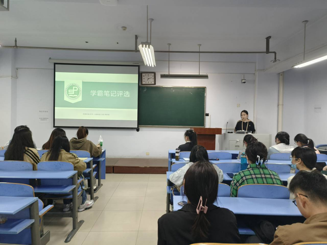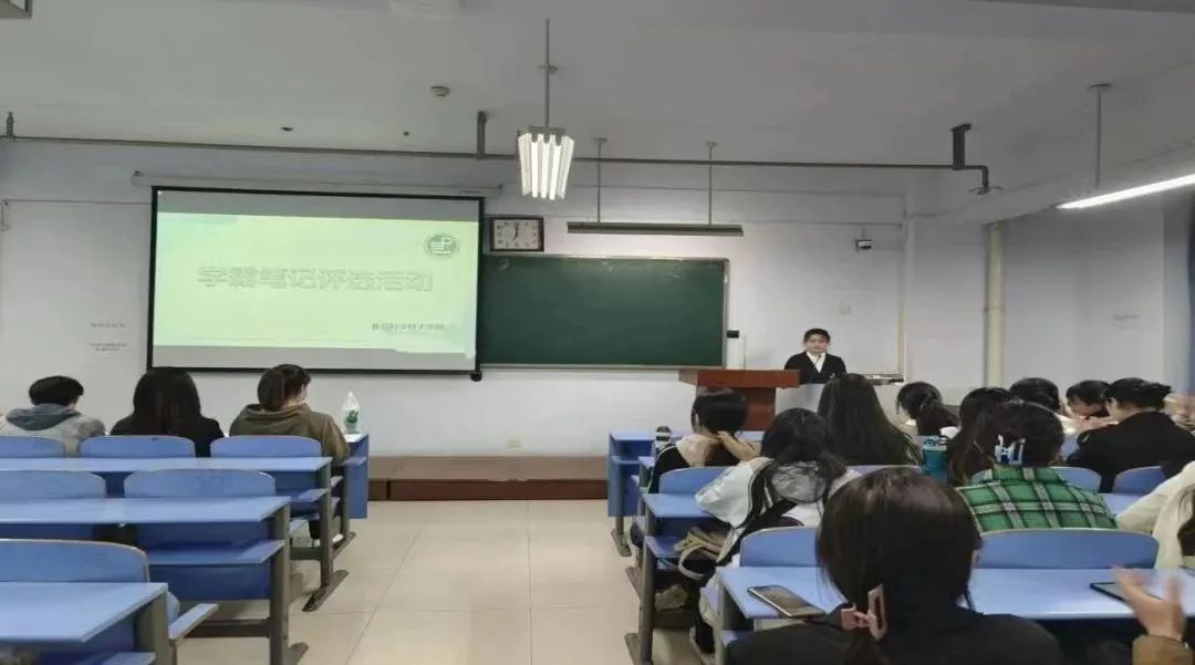 评选活动以PPT讲解的形式举行,主要内容包括自我介绍、笔记展示、成绩及荣誉展示三大部分。评选现场,各参赛选手依次进行答辩,在讲台上一展风采,对自己的学习成绩和笔记进行展示,随后,评委对各参赛选手的表现及笔记内容进行现场打分,由学实部成员进行数据统计,并计算最终结果。