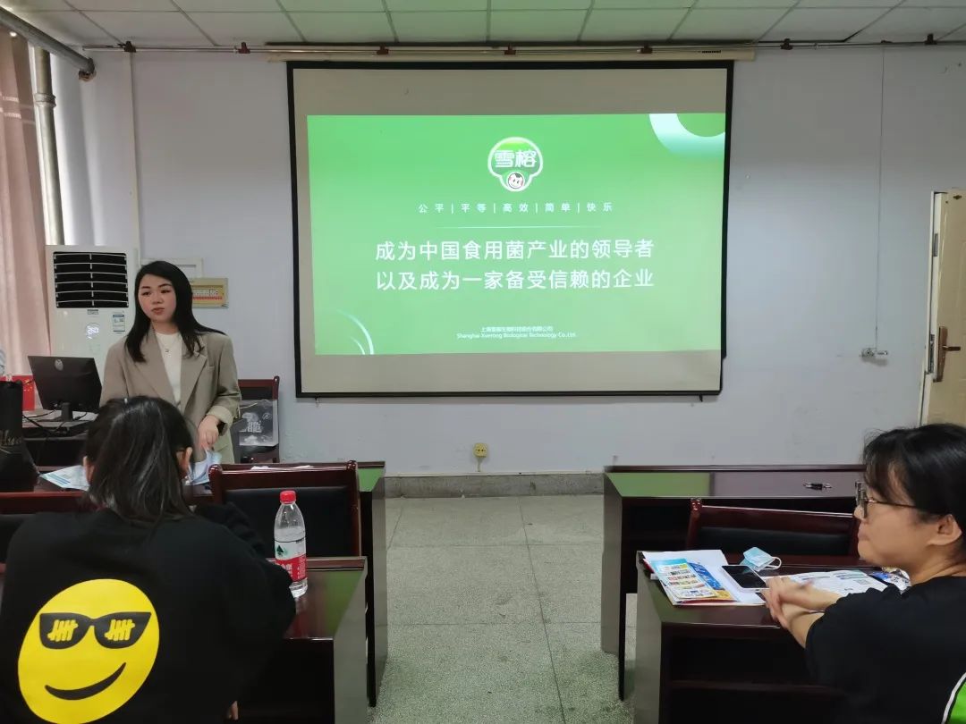 会议伊始,何陈燕通过播放公司宣传片让同学们对上海雪榕生物科技有限公司有了初步的了解。她从走进雪榕、人才战略、岗位及福利三个方面对公司进行详细介绍。她讲到,雪榕生物是中国航天事业的战略合作伙伴,同时也是农业产业化国家重点的龙头企业,专注于科学培植食用菌,推行均衡膳食之道。公司始终秉持尊重人才、以奋斗者为本、让奋斗者有获得感、幸福感、安全感的人才理念,培养优秀人才,注重员工未来发展。她通过PPT展示了公司的食宿环境、员工福利、资薪待遇,希望同学们可以积极投递简历。