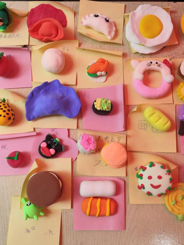 参加活动的同学来来往往,他们用双手创造惊喜,小小的橡皮泥被捏的形态各异。喜欢的食物是什么样子?同学们发挥自己的创意,在作品上给出自己的理解。