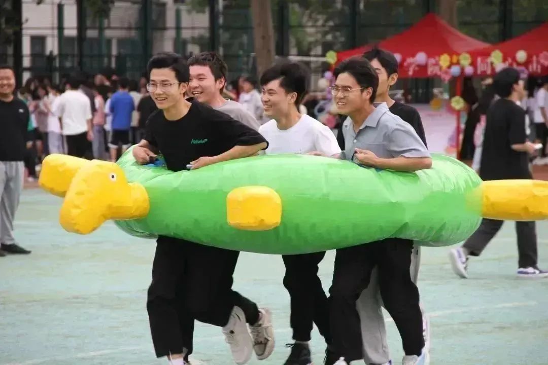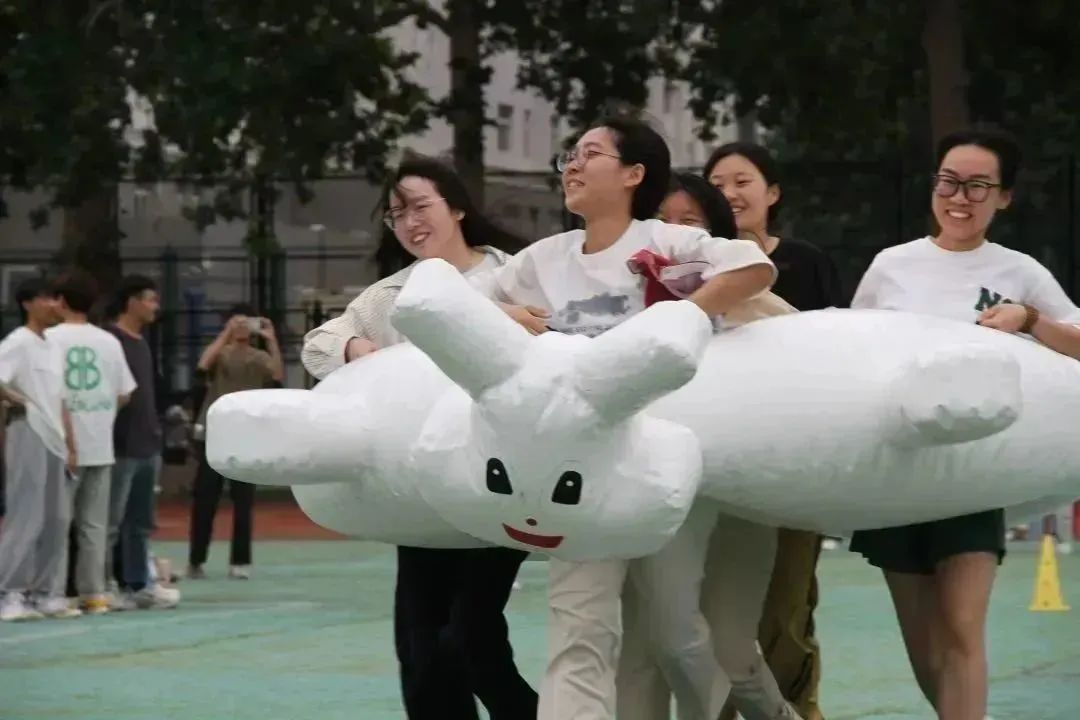 “龟兔赛跑”作为一项团体游戏,同学们需要组成五人小队套在乌龟玩偶的环心中,配合着去进行一系列行动,如果没有十足的默契,小队很难移动,甚至会互相绊倒在地。