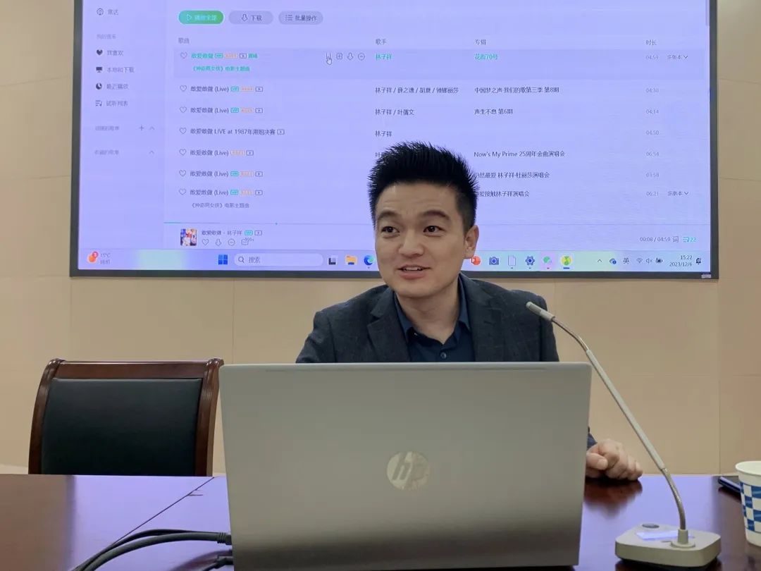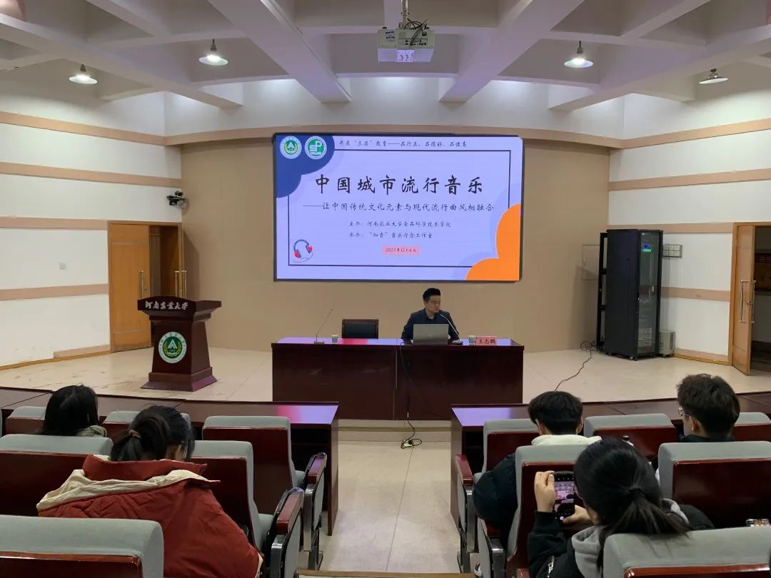 会议伊始,王志鹏进行了简单的自我介绍并讲述了中西音乐形态的不同,他详细阐述了流行音乐的发展及不同地区的流行音乐,加深了同学们对中国城市流行音乐的理解,他围绕古代城市流行音乐、港台流行音乐、大陆流行音乐展开叙述,表达了对传统文化和现代流行音乐融合的期待和信心。活动期间,他通过播放《蒹葭》《关雎》《杏花天影》《沉默是金》《青花瓷》等音乐,向同学们具体举例,调动了现场气氛,并提出音乐对身心健康的重要影响,希望同学们可以通过多听音乐来减轻自身的学习压力,疗愈身心健康。