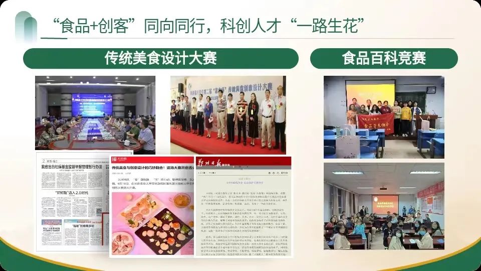 着力引导青年学生走入企业、走向社会,走进一线,用食品安全与营养科普知识服务社会、服务人民,上好“走在中国大地上”的实践大课堂。让学生在冒热气、粘土味的实践中,厚植爱农情怀,练就兴农本领。在全国大学生“食品安全与营养中国行”活动中荣获全国二等奖。“百企千生”社会实践团深入河南省、山东省等全国100多个乡村、食品企业、生产一线学习调研,创办汝阳香菇科技小院,把课堂所学食品专业知识和乡村振兴紧密结合起来,通过实践让学生在学校就熟悉行业发展,了解社会需求,培养服务社会热情。培养出致力于食品行业发展的三全技术中心主任冯志强、广州立白集团公司省区经理苏建强等企业骨干;带领乡亲们致富的西平县蔡寨乡人大主席陈克战、兰考县葡萄架乡党委委员卜大品等基层就业先进。