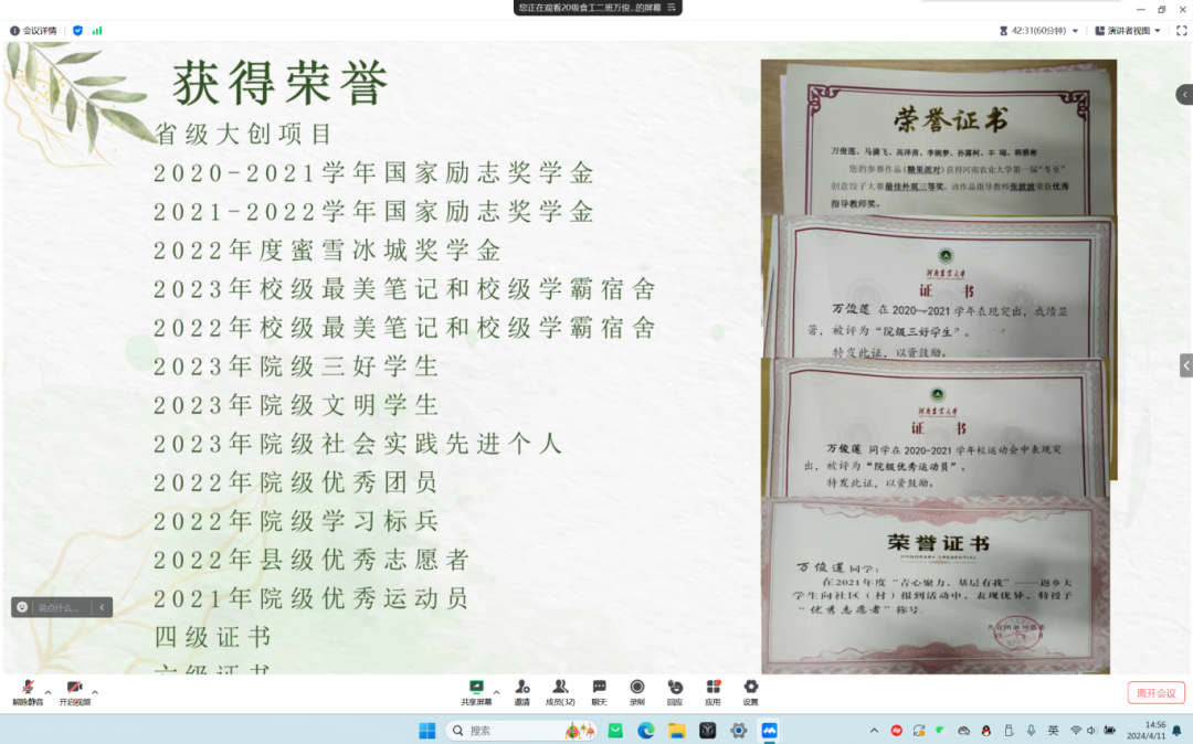 会议伊始,张金龙向参评同学和评委宣读了评选要求及评选规则,22位参评同学依次进行自我介绍,他们分别从思想、学习、生活和工作等各方面对自己即将结束的大学生活做出总结,并展示了大学以来所获荣誉和学业成绩,不论是选择就业还是继续深造,他们对自身都有清晰明确的规划,得到了评委老师们的认可。