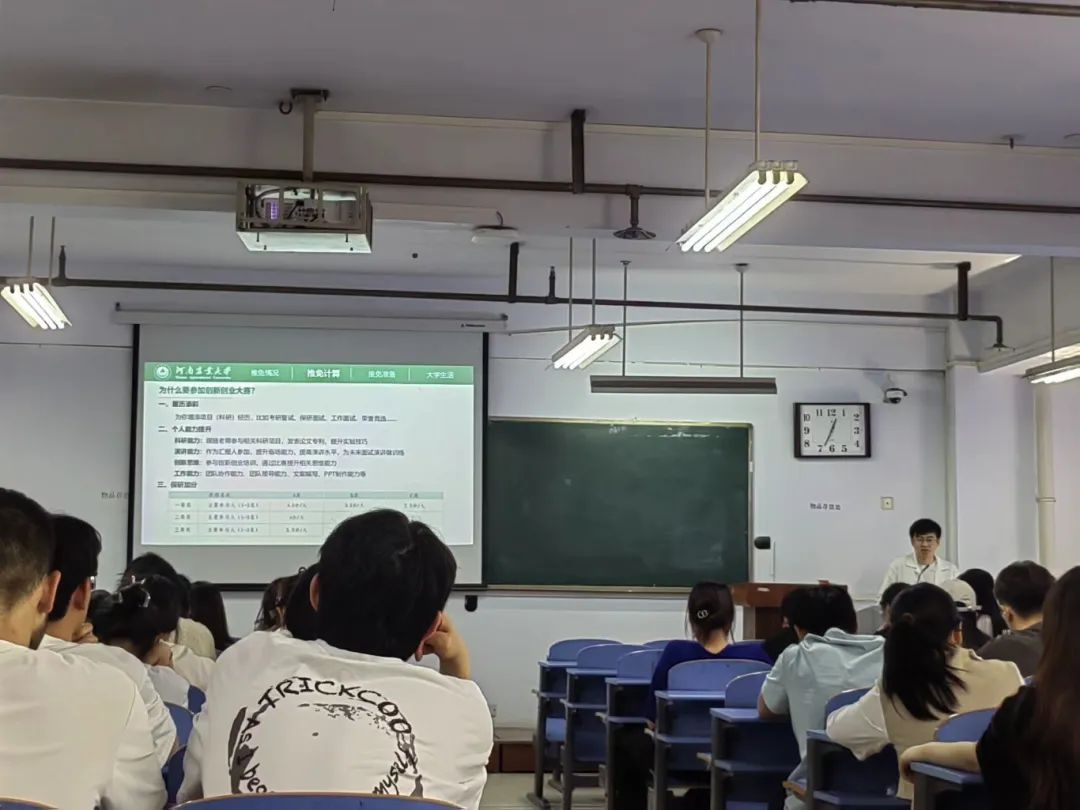 会议伊始,拥有丰富比赛经验的20级安一班郭倚成为我们分享经验和比赛心得,他为大家介绍了一些创新创业赛事类型,组队的注意事项和比赛的收获。他通过对教育维度、团队维度、社会价值维度等一系列的详细介绍,让同学们更加全面清晰地了解到赛事相关内容,明确目标。同时郭倚成鼓励同学们积极参加科创赛事,在备赛的过程中发挥专业特长,积累相关经验,为日后的学习与工作奠定基础。