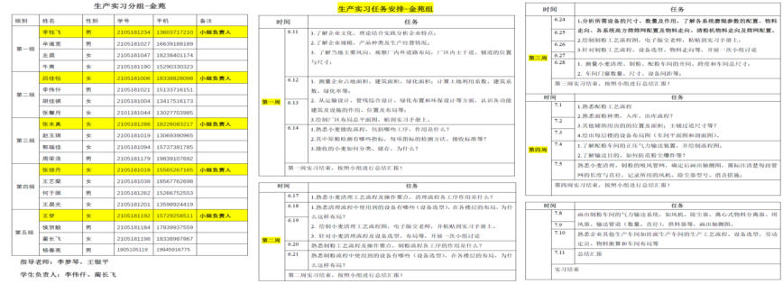 长张剑提前协调,亲自到厂与金苑粮油有限公司曹总和各部门领导商谈了具体实习内容;并由带队老师给实习生们进行分组,根据实习内容制定详实的实习计划,具体到每日计划、每周总结,要求学生相互学习,相互支持,以提高他们的团队合作意识。确保学生实习的每一天都能有所收获,提高工作效率,及时总结反思,做到今日事今日毕,切实保障实习的顺利进行。