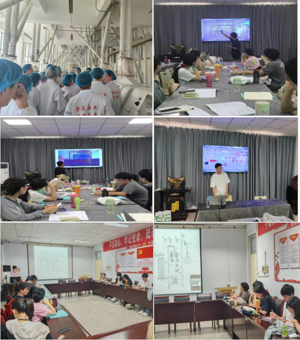 学生们按照生产实习任务安排,首先对金苑全厂总平面进行了实地测量和绘制工作,包括厂区道路、建构筑物、绿化等方面的设计,加深了对食品工厂总平面布局的理解和认识;其次,学生们深入制粉车间进行参观学习,从原粮接收到小麦清理,再到小麦制粉工艺,从设备选型到物料走向,再到参数设置等,以小组合作的方式,进行测量、记录、学习;遇到不懂的地方,及时向车间工作人员虚心请教,脚踏实地地将大学所学理论知识与生产实践相结合,系统学习了小麦制粉的相关知识。最后,在每周汇报过程中,同学们对每周的实习收获进行了展示、交流和讨论;并通过李梦琴教授的解答,对小麦清理流程和制粉工艺流程等方面有了更加完善的认识。