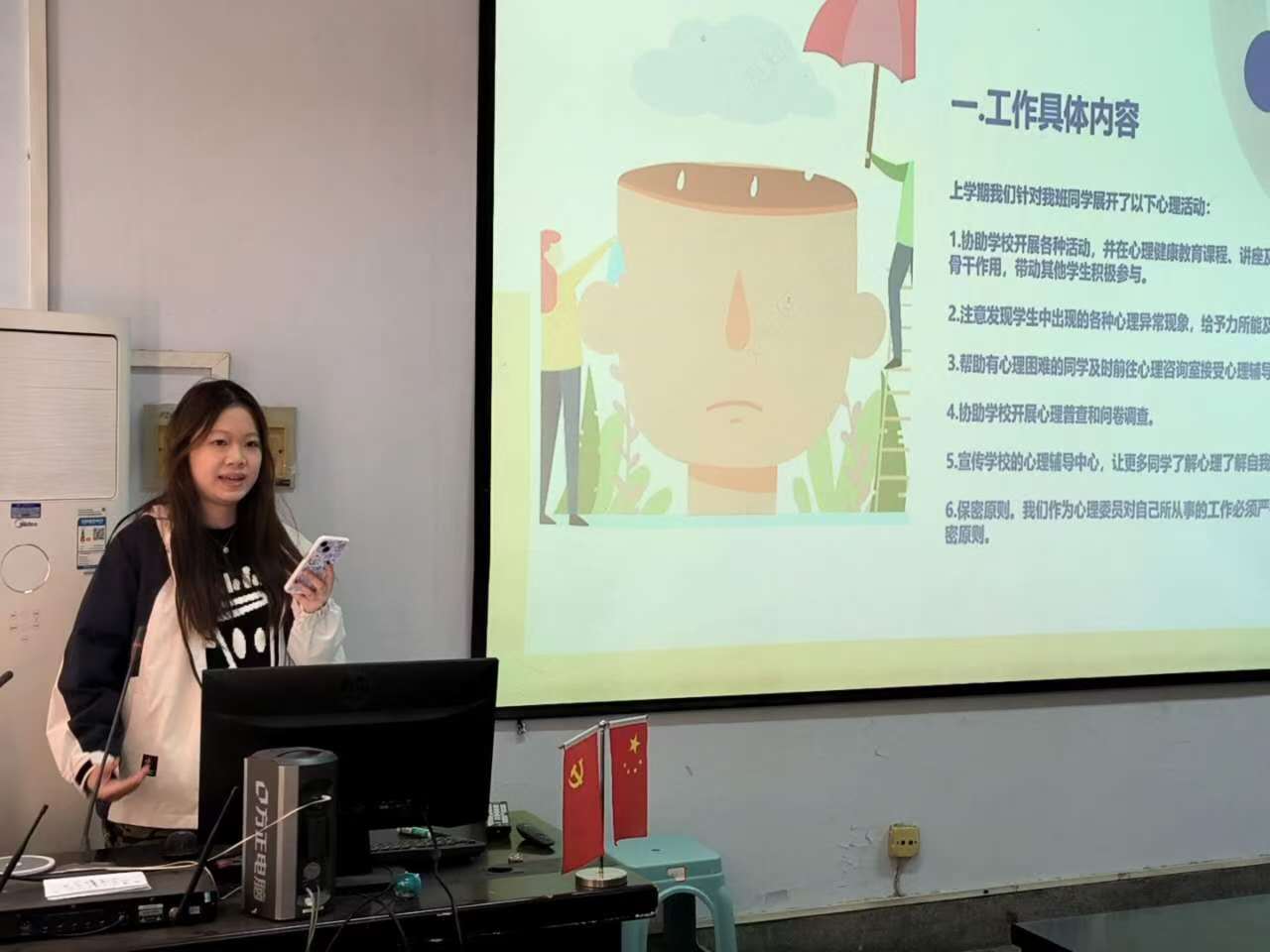 心理活动,加强与班级同学的沟通交流;尹晨曦提出要关注班级重点人群,提供个体化辅导,以此缓解学生心理压力;何盛境通过展示个人心理工作内容,引导大家在班级中开展心理健康教育宣传工作,关心同学们的情绪变化,及时发现问题、解决问题。