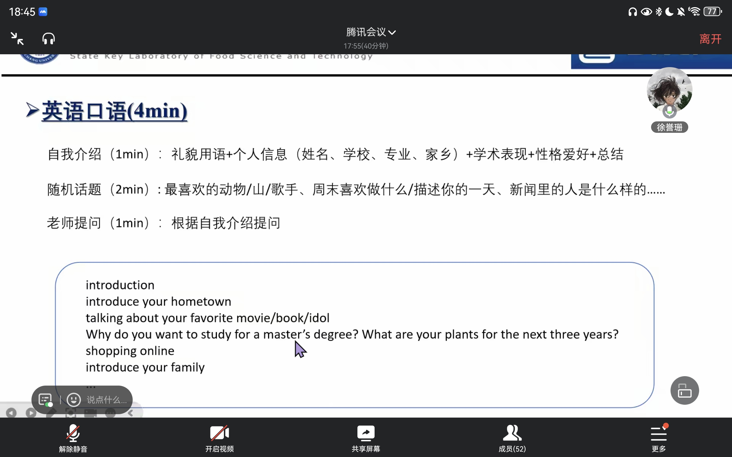 会议伊始,徐誉珊学姐结合自身的考研经历,向同学们详细地介绍了复试流程、复试内容和复试准备三方面内容,并指出复试时需要注意的问题。她还为大家展示了自己当时复试时准备的PPT,为大家提供了一个明确的方向。