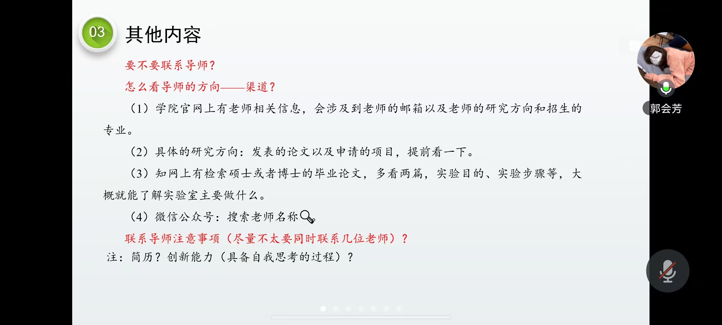 郭会芳学姐就复试流程、备考方法、面试技巧、心态调整等方面进行了详细讲解,同时她还特别提到要不要联系导师,什么时候联系导师,如何联系导师,为考生们提供了宝贵的经验和建议。