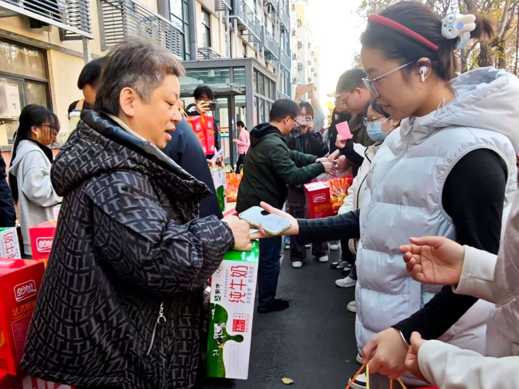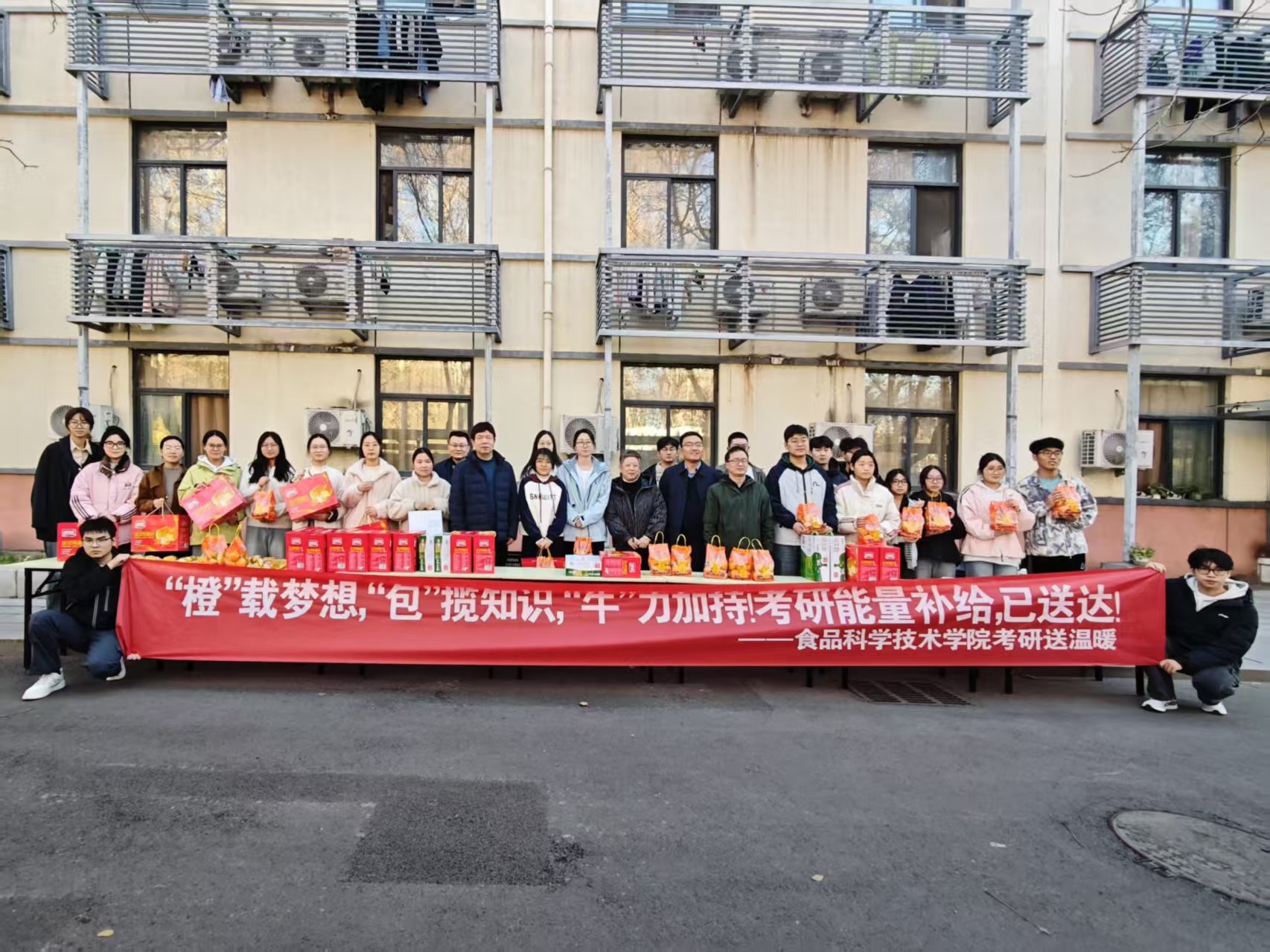 最后,领导老师们亲手为同学们送上了精心准备的暖心物资——新鲜饱满的橙子、松软可口的面包与营养醇厚的牛奶。一份份物资承载着学院对学子们的深切关怀与殷切期望,也传递着最真挚的祝福:愿同学们“橙”载梦想,乘风破浪;“包”揽知识,落笔生花;“牛”力加持,勇往直前!同学们接过这份沉甸甸的温暖,脸上绽放出灿烂的笑容,纷纷表示将把这份关怀转化为备考的动力,以更加昂扬的姿态投入到后续的复习中,不辜负学院的信任与期待。