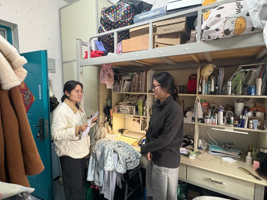 走访中,老师们围绕反诈防骗、消防用电、财产安全等重点领域进行检查提醒。针对大功率电器、私拉电线、楼道杂物堆积等情况现场提出整改意见,叮嘱同学们增强安全意识;结合近期高发诈骗案例,提醒大家警惕陌生信息,保护好个人信息与财产安全。同时,温馨提醒离宿时锁好门窗,妥善保管贵重物品。